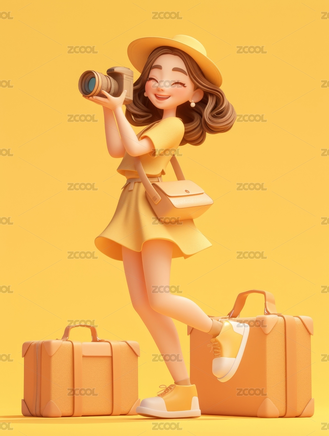拉着行李箱拿着相机去旅游3D卡通女孩插画