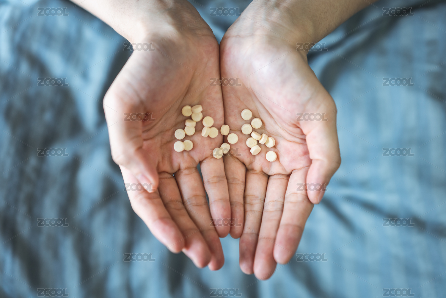 病人卧床双手捧着大量药片