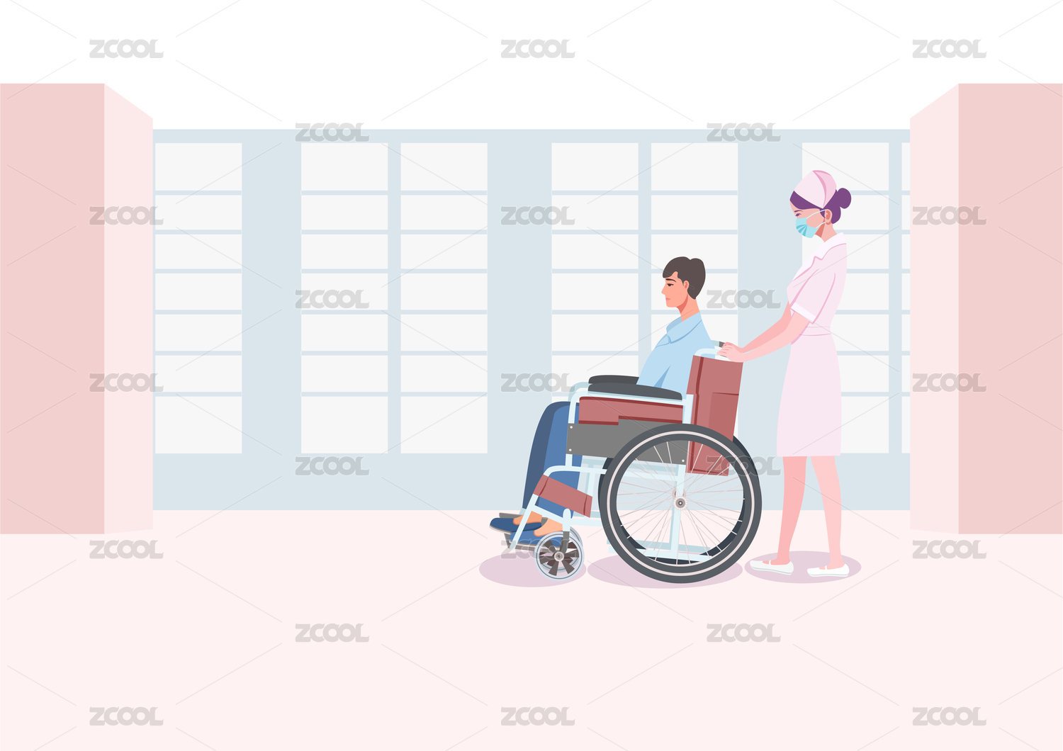 女性护士用轮椅推着男病人矢量插画