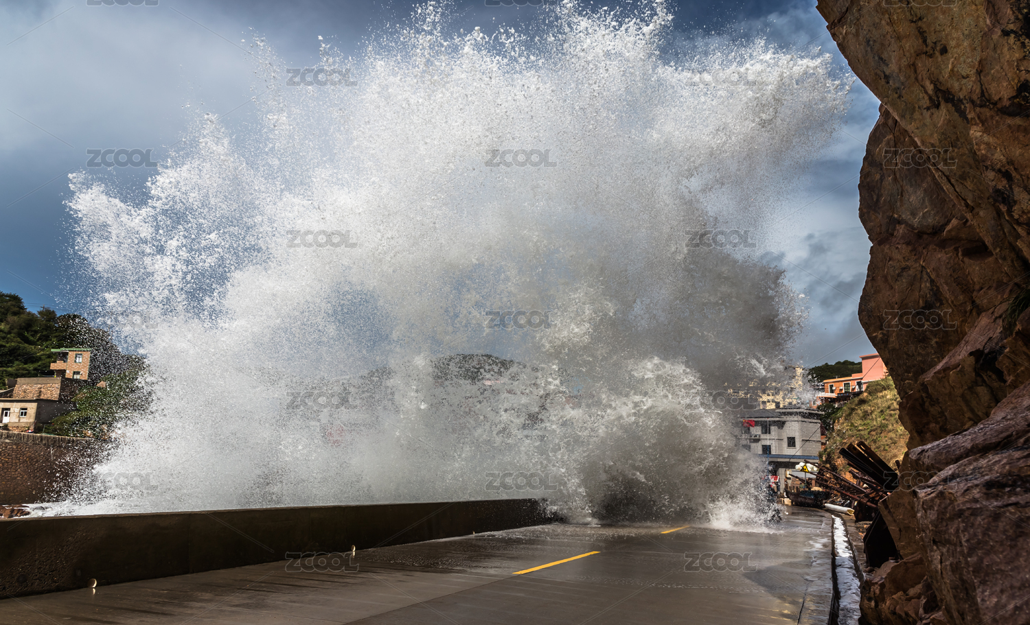 中国东海浙江舟山群岛枸杞岛渔场海堤台风中的海浪