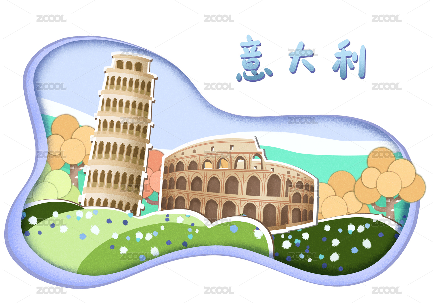 剪纸风格意大利国家地标建筑比萨斜塔和竞技场插画