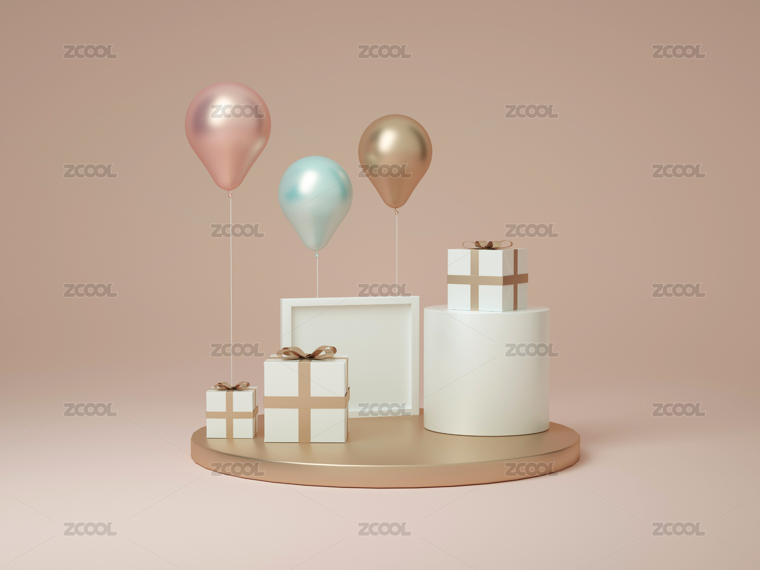 五彩缤纷的生日气球聚会庆祝活动中场景,粉色背景,生日派对3D渲染