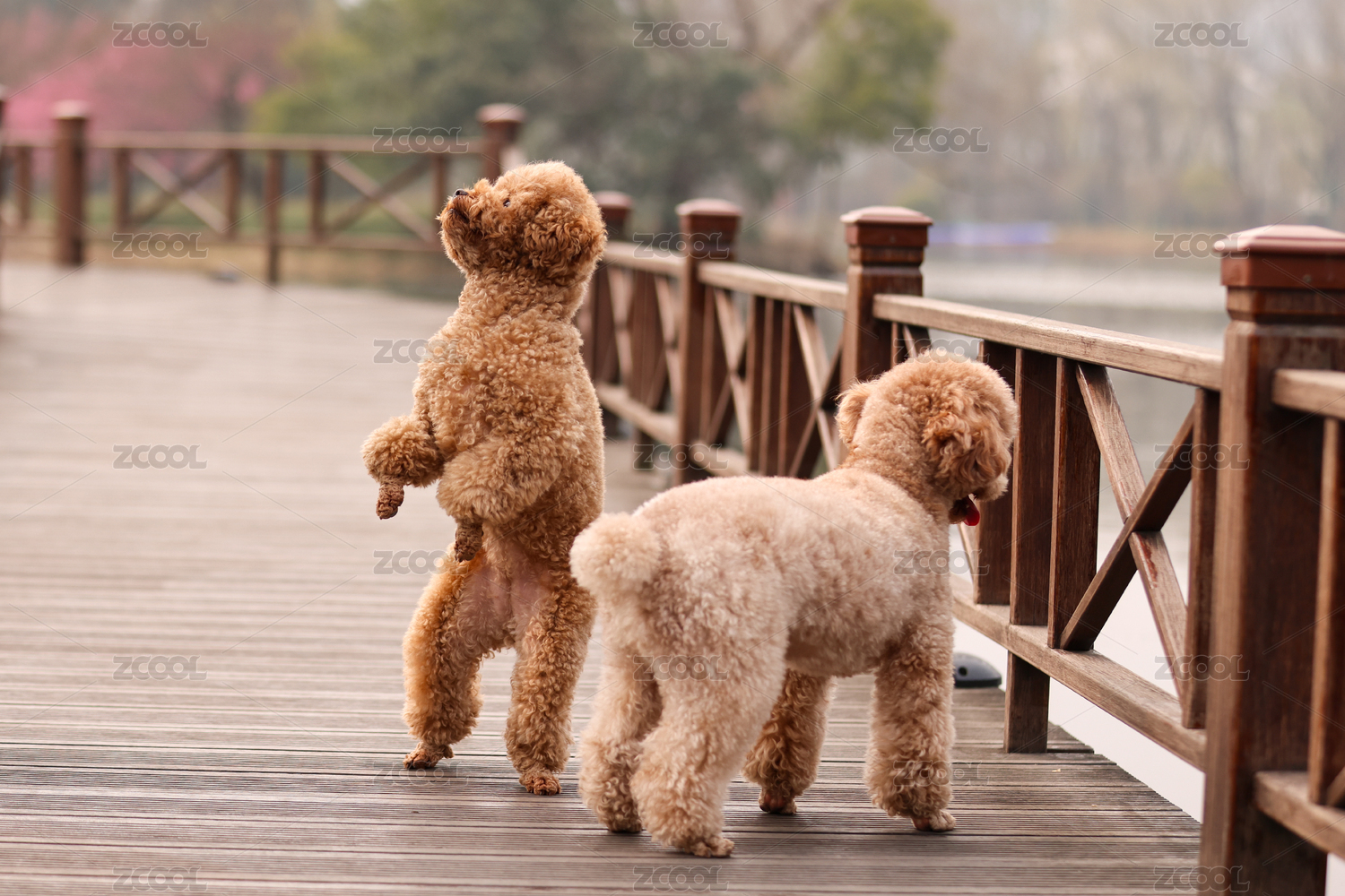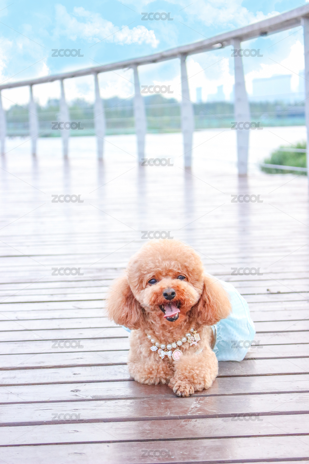 长春南溪湿地桥上一只带着项链咖啡色泰迪犬