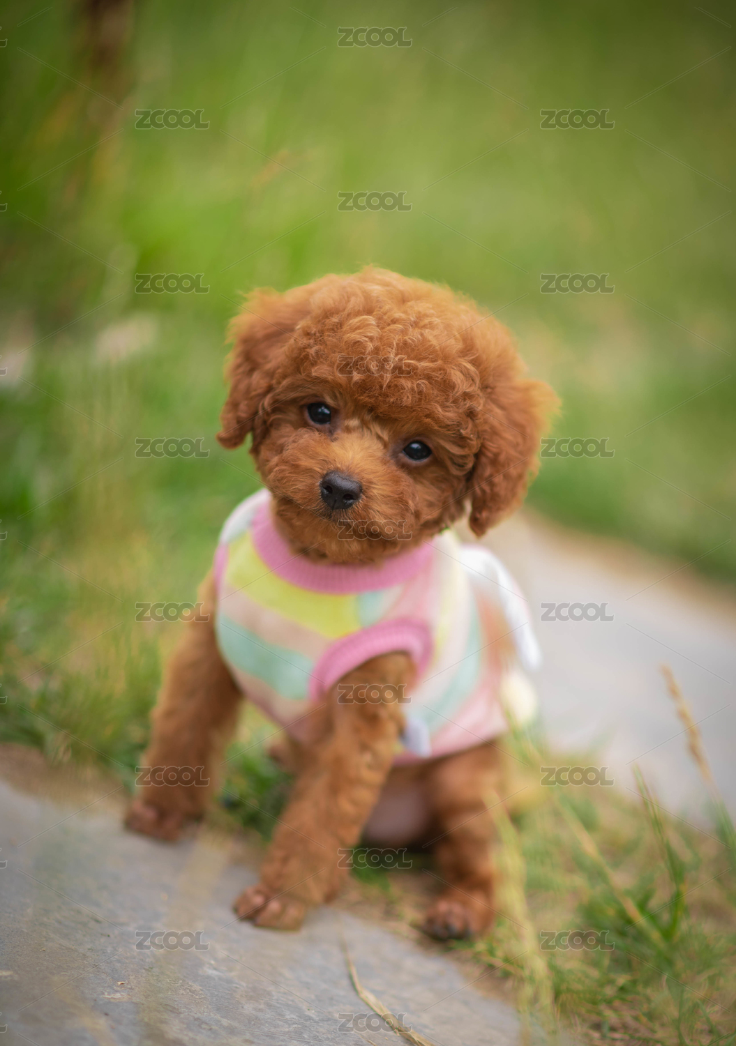 在绿树环绕的公园里,一只穿着衣服的棕色小泰迪犬坐在地上