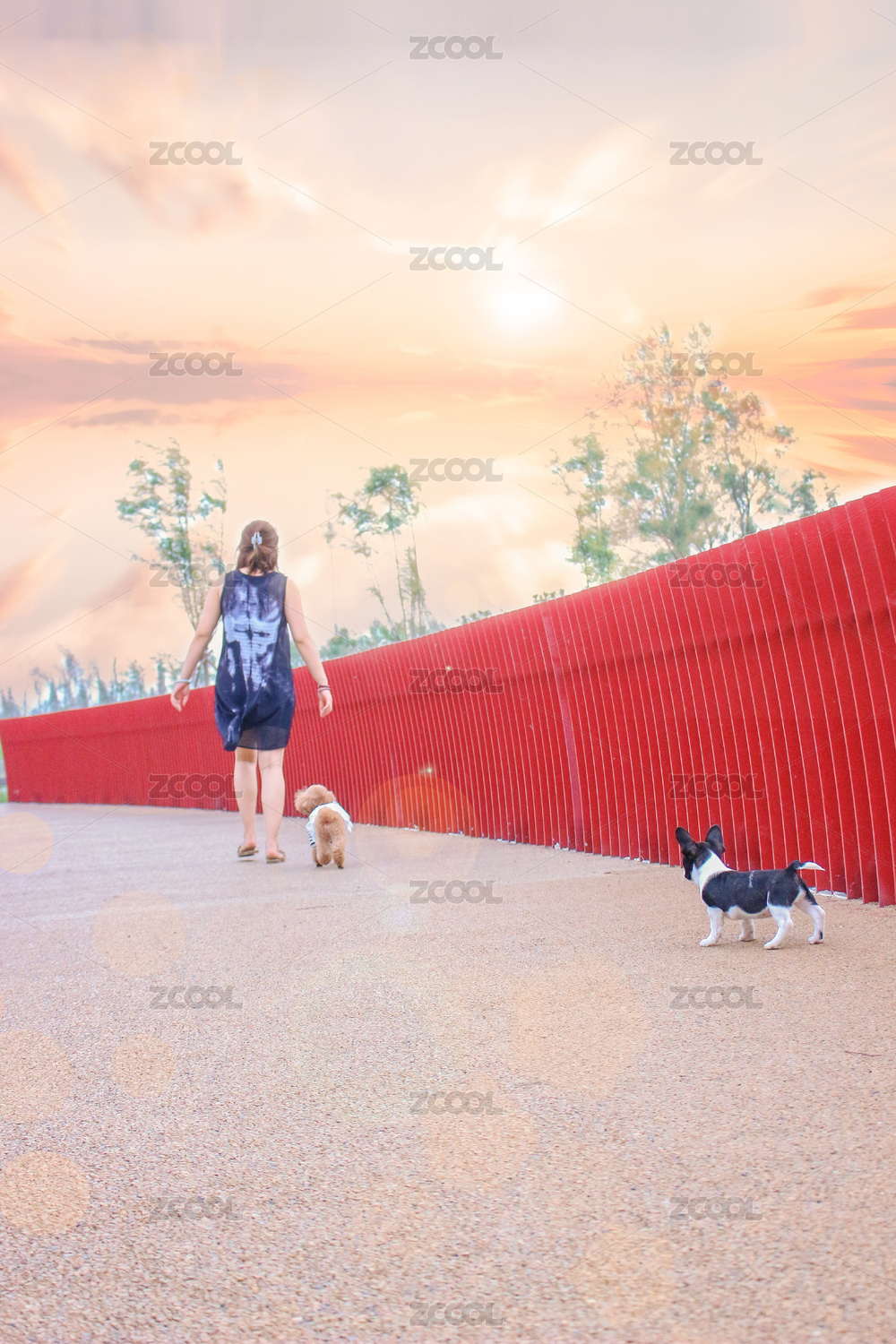 咖啡色泰迪犬和黑白相间法国斗和主人散步