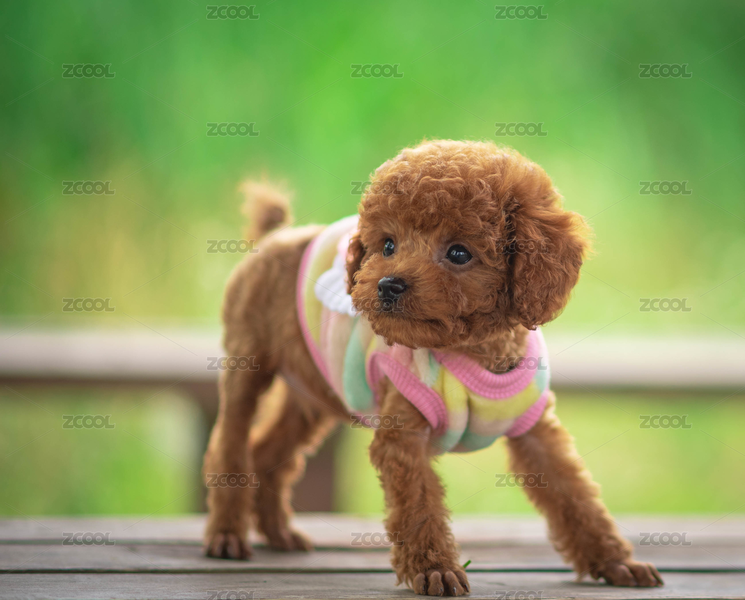绿树环绕的公园里,在实木椅子上站着一只穿着衣服的棕色小泰迪犬转头往斜上方看