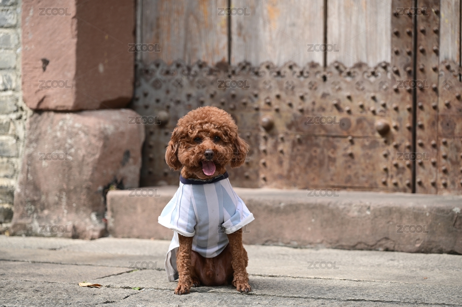 中国深圳甘坑古镇仿古屋门前的宠物泰迪犬