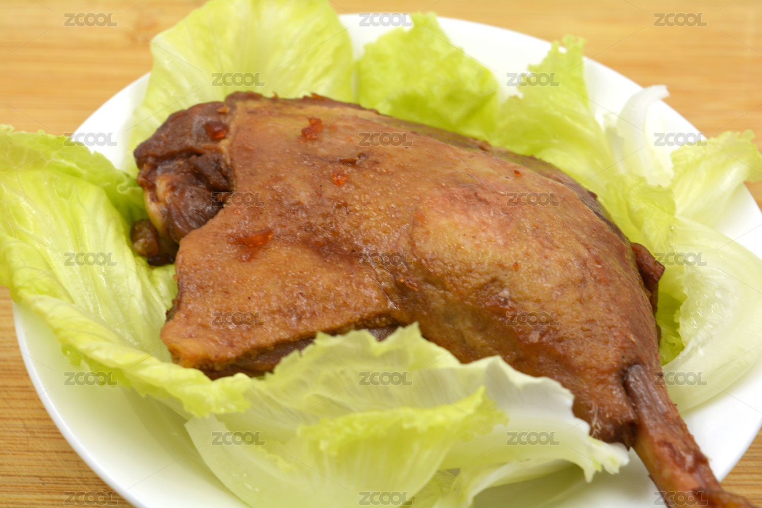切菜板上的小盘子里装着一只酱鸭腿和几片生菜