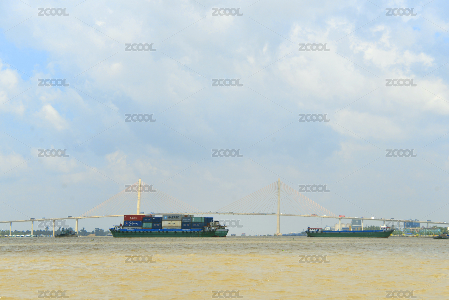 越南前江省湄公河上的大桥及货船