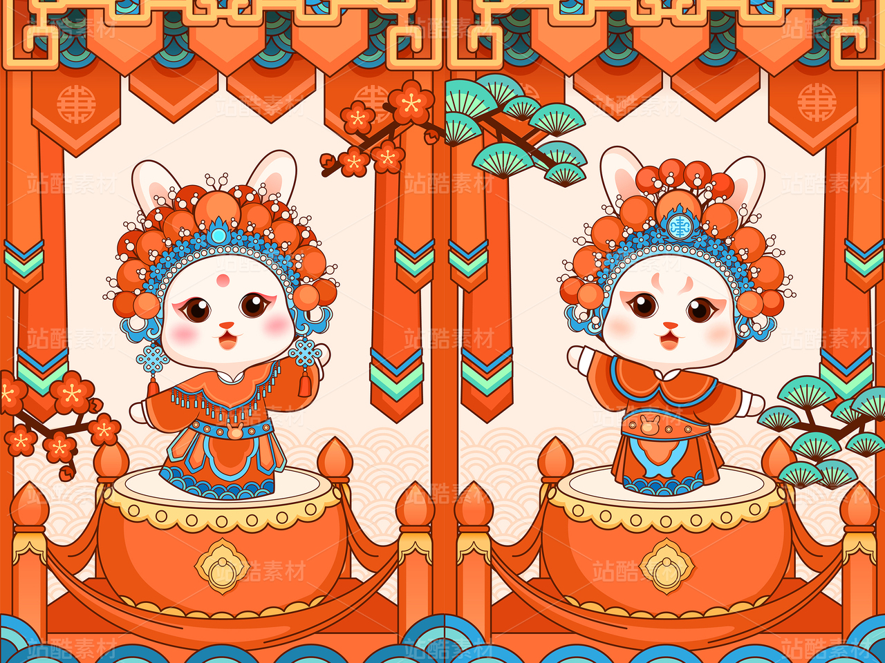 中国花旦武生戏曲卡通图国潮插画