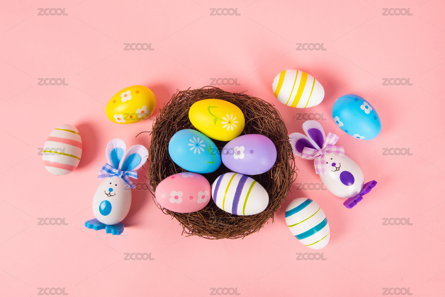 粉色背景上的复活节彩蛋小兔子