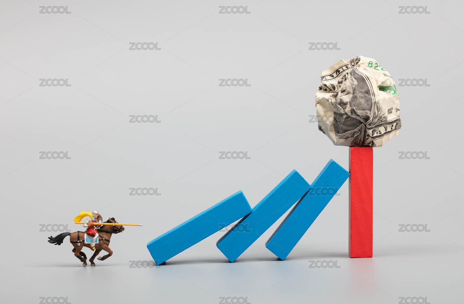 微缩创意骑士冲击挑战多米诺骨牌上的美金