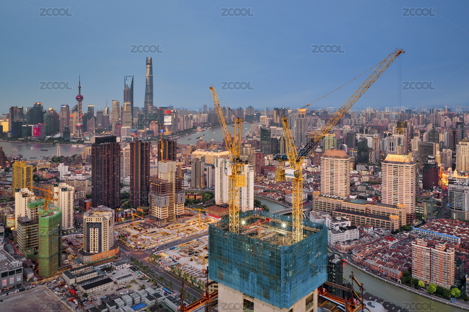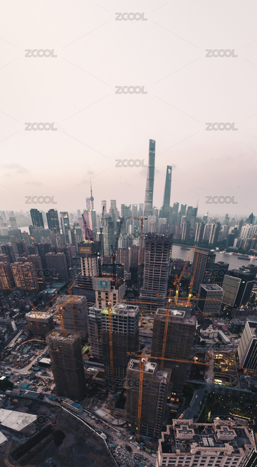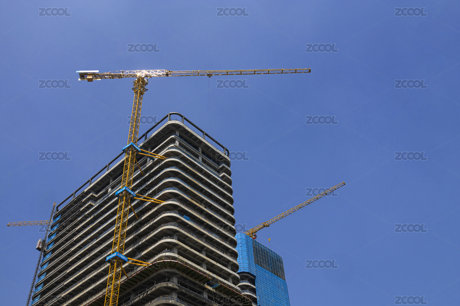 蓝天白云下建设中的城市天际线建筑大厦风光