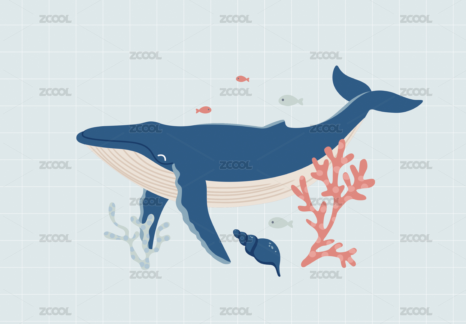 蓝格背景上的藏蓝色大鲸鱼背景图案卡通珊瑚