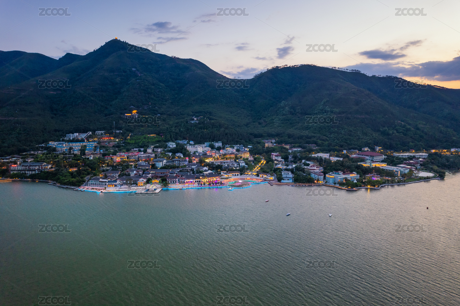 凉山州西昌市邛海湿地公园黄昏夜景航拍
