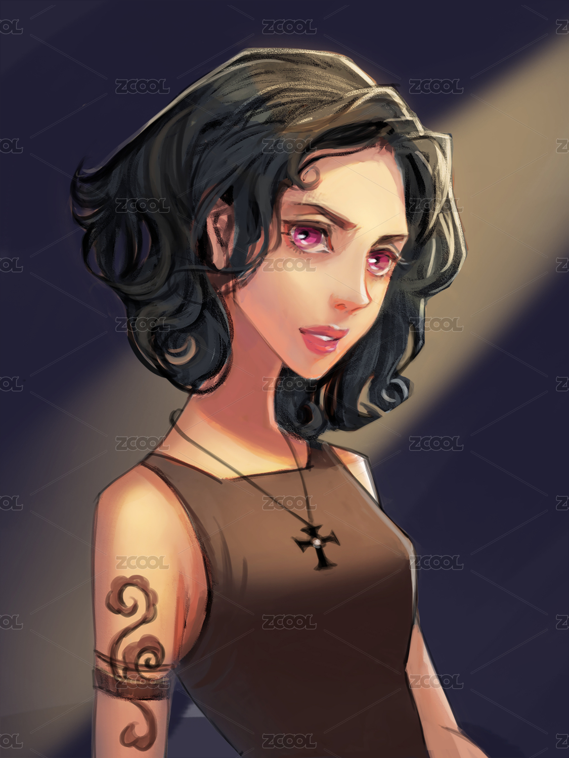 欧美眼神犀利手绘插画黑色卷发少女半身胸像