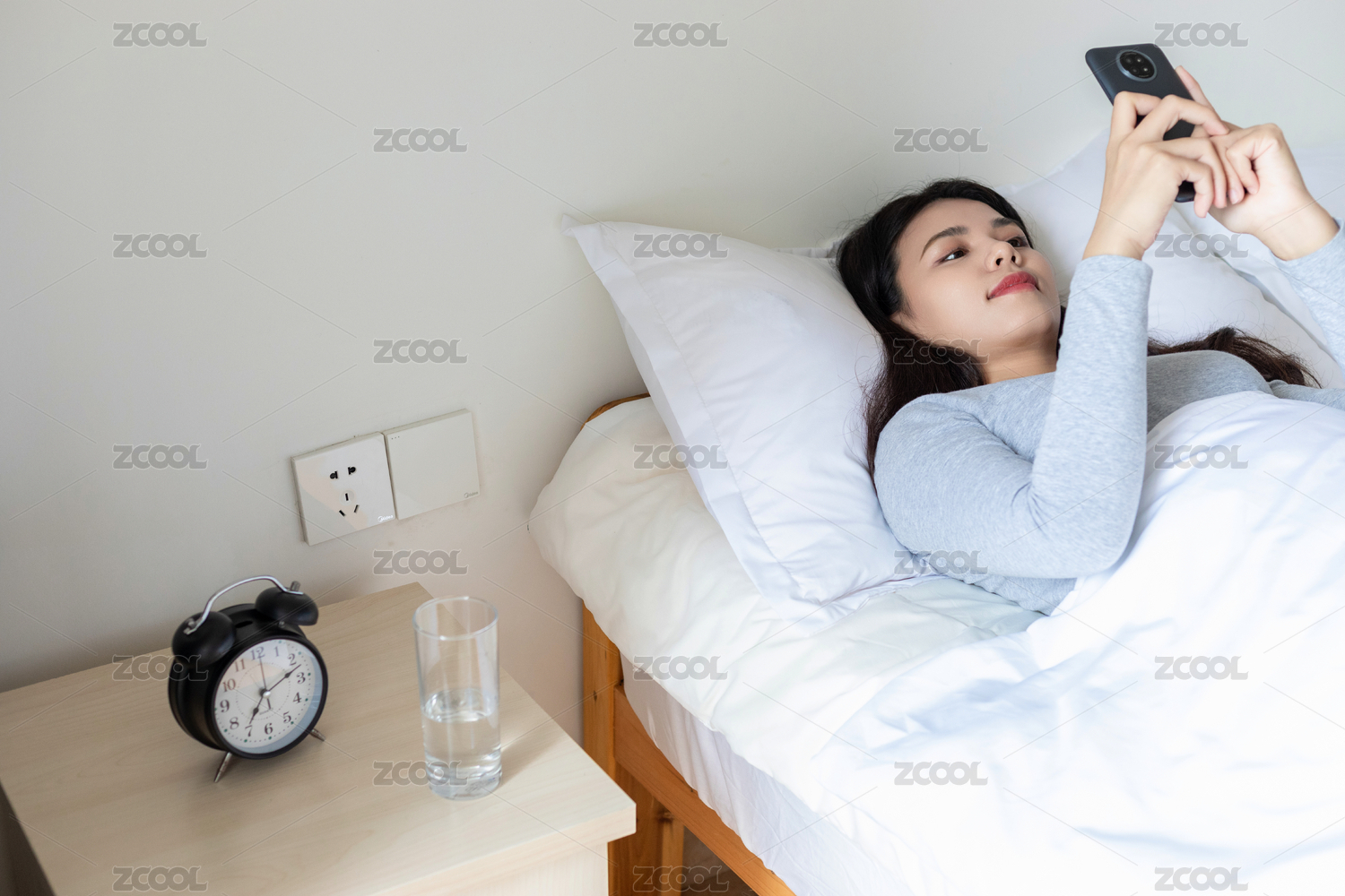 卧室床上一名中国美女玩手机