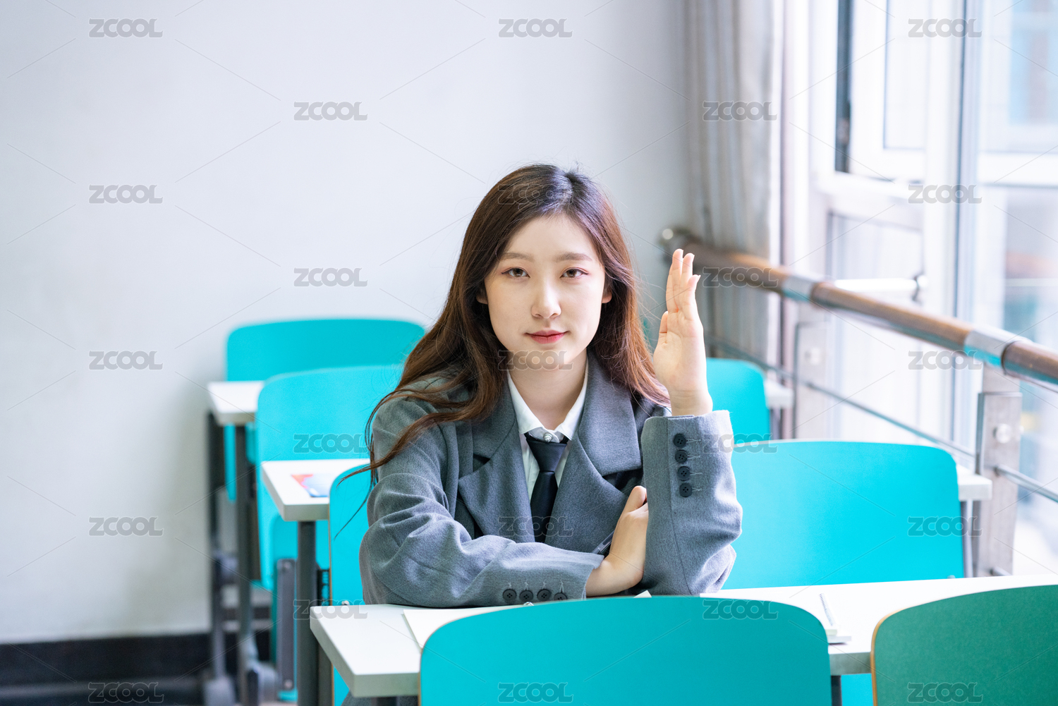 中国美女大学生在教室内认真上课举起手提出回答问题