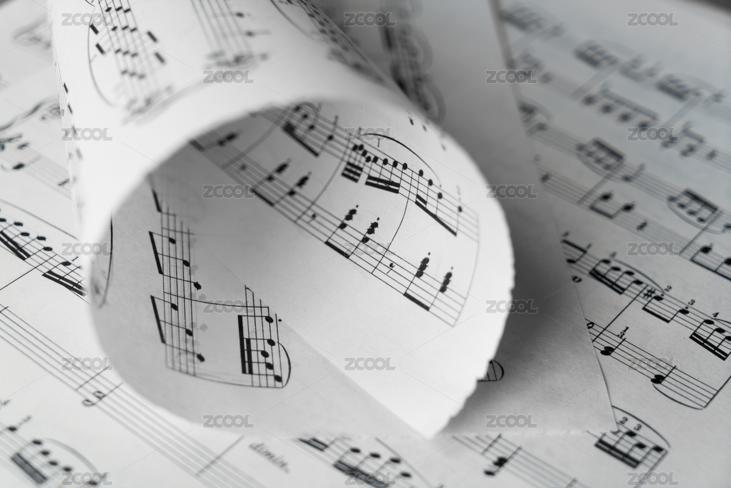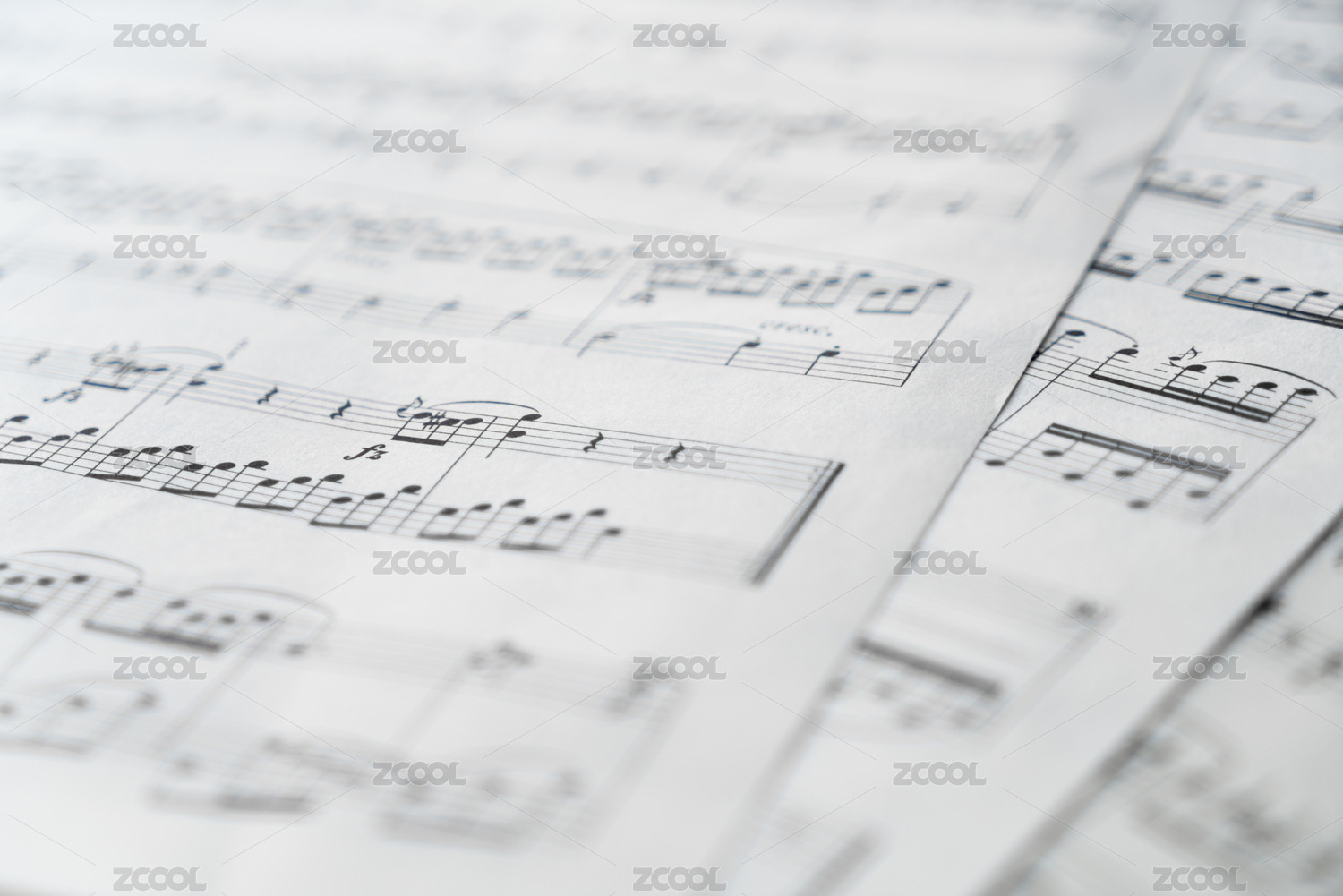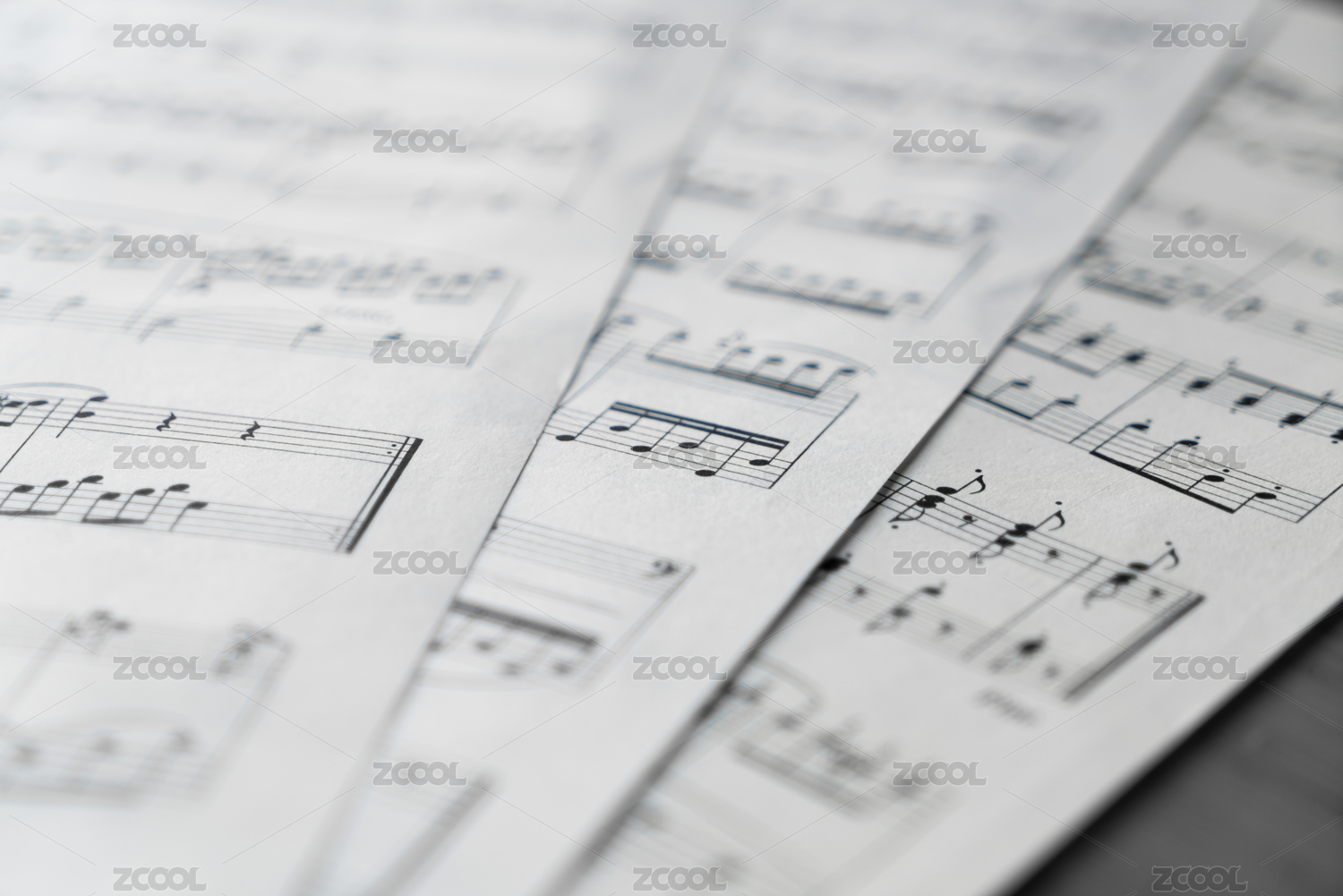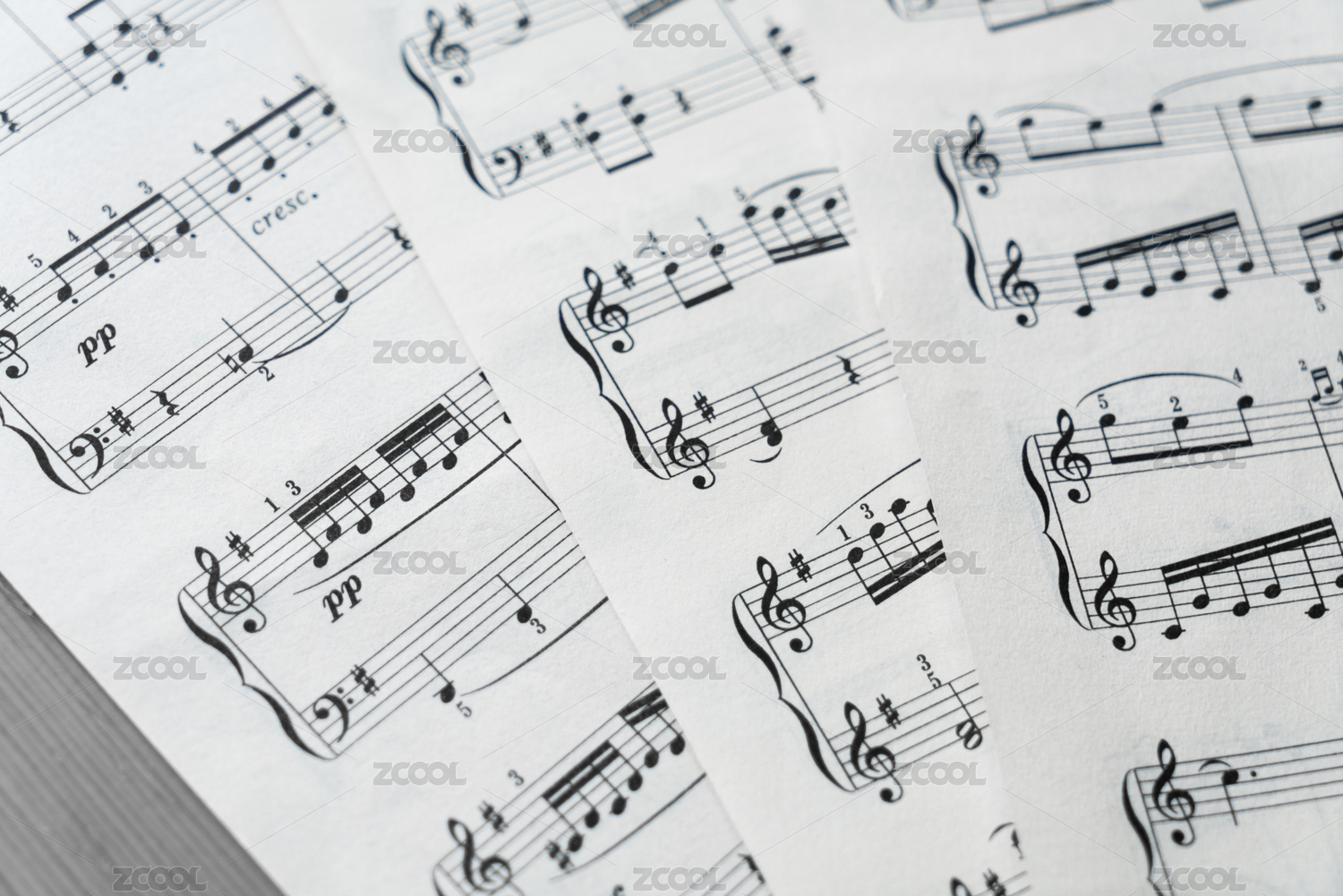 印有乐谱五线谱的纸张散落在桌面上