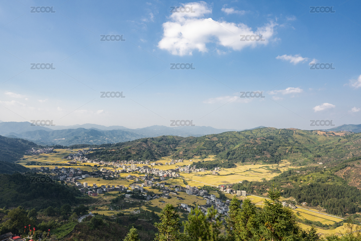 山谷中成片成熟的稻田及夹杂着的土楼民居,中国福建永定