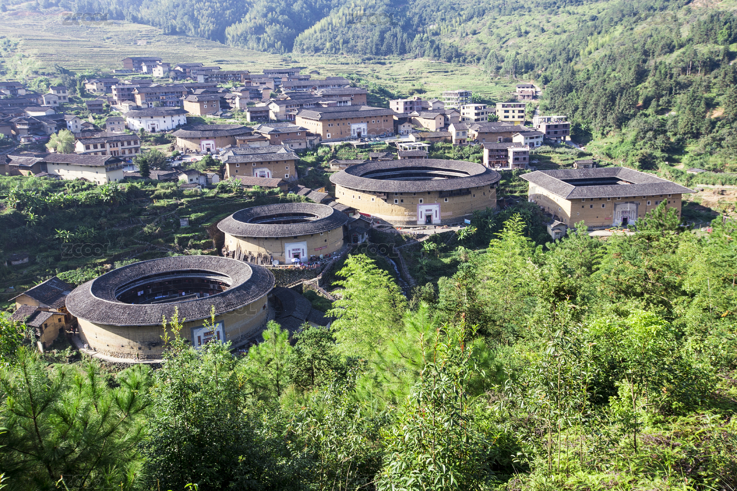 绿树掩映着的世界文化遗产永定客家土楼
