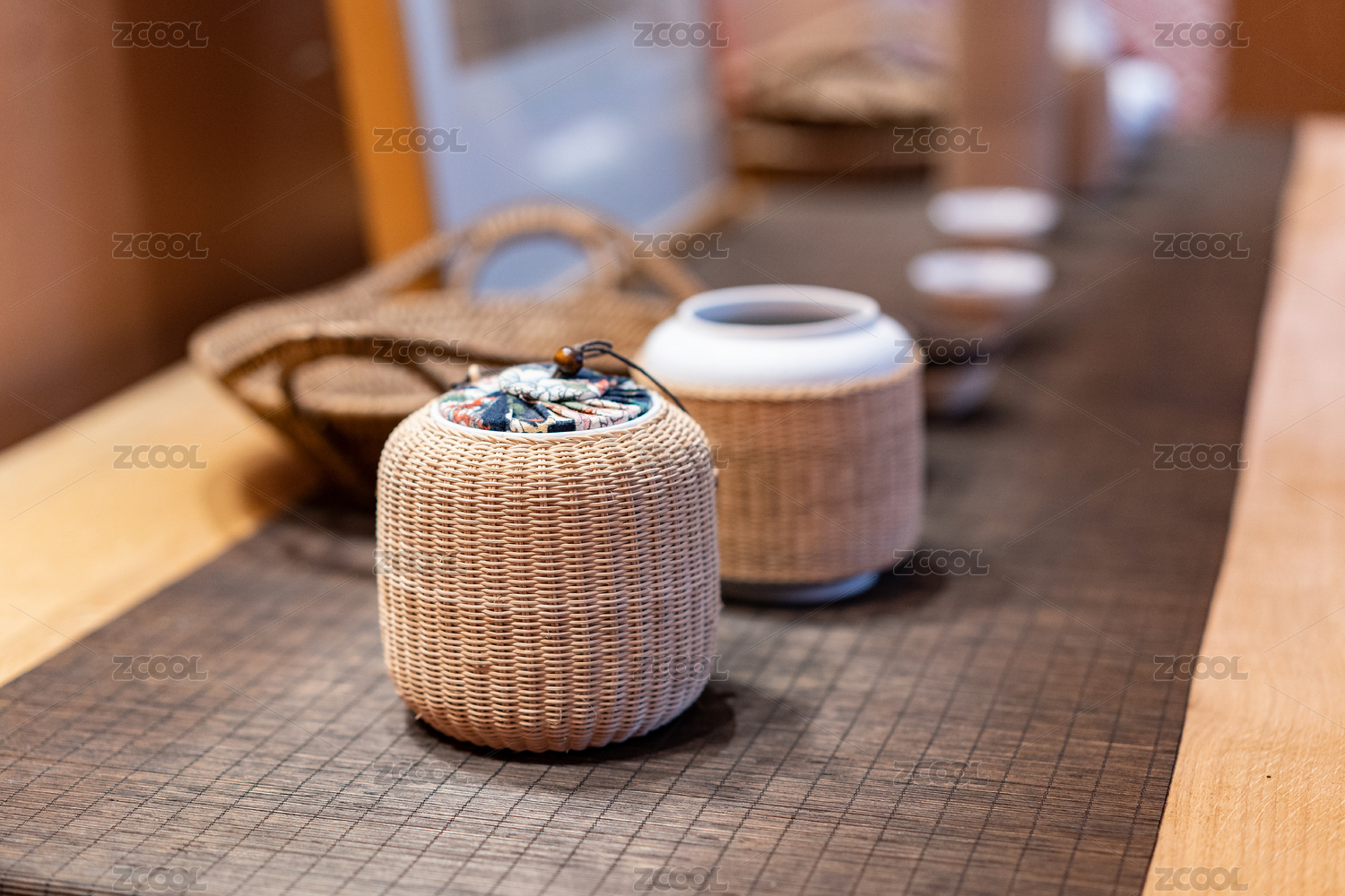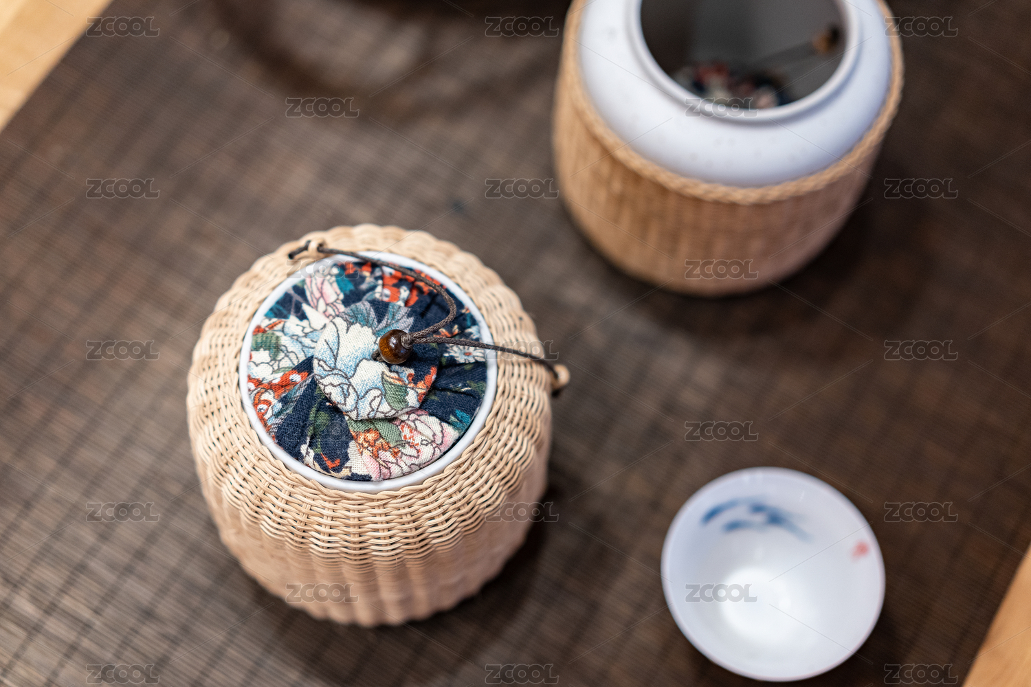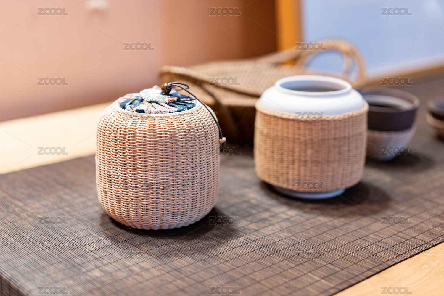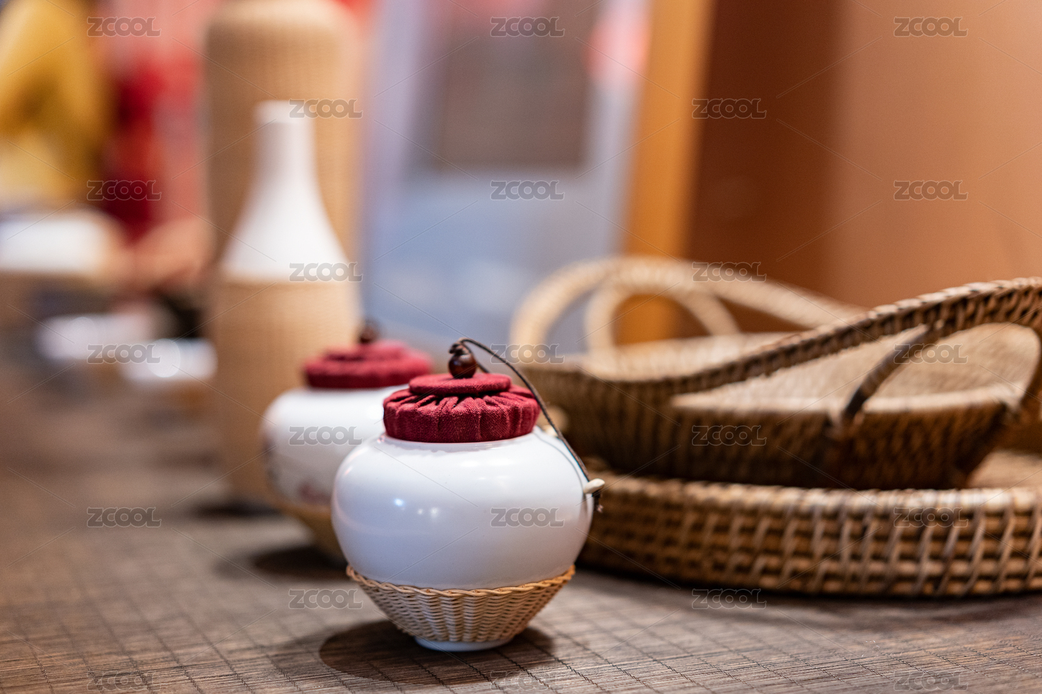 桌面上摆放的带有藤编保护套的瓷器茶具