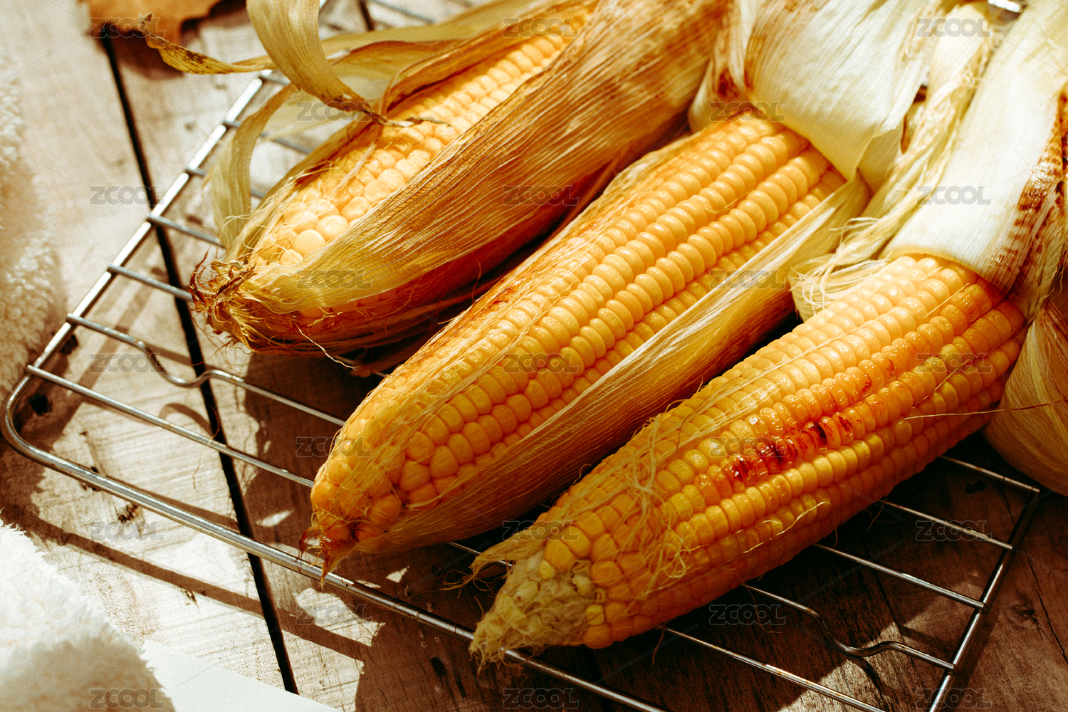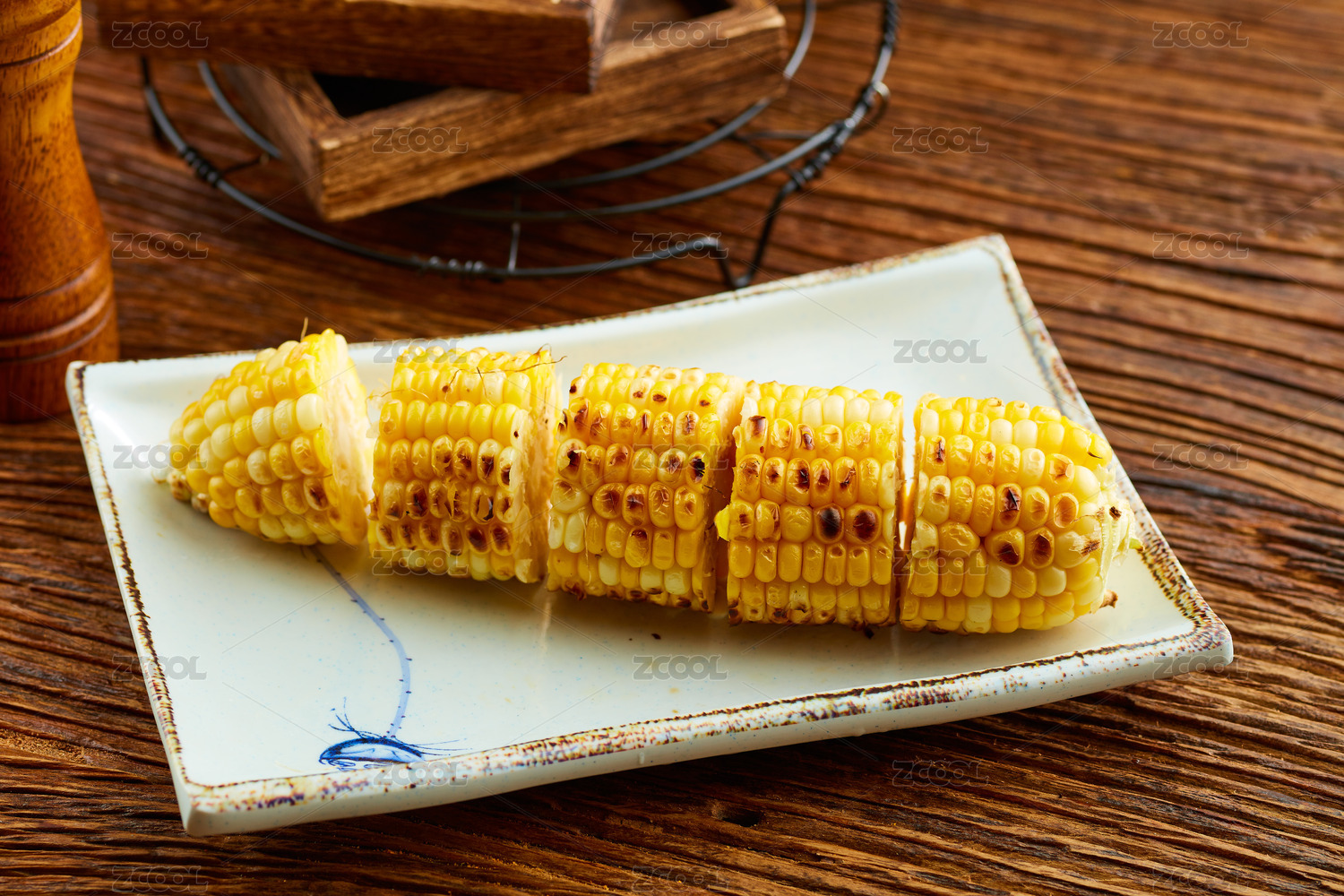 木底上放着一盘烤玉米