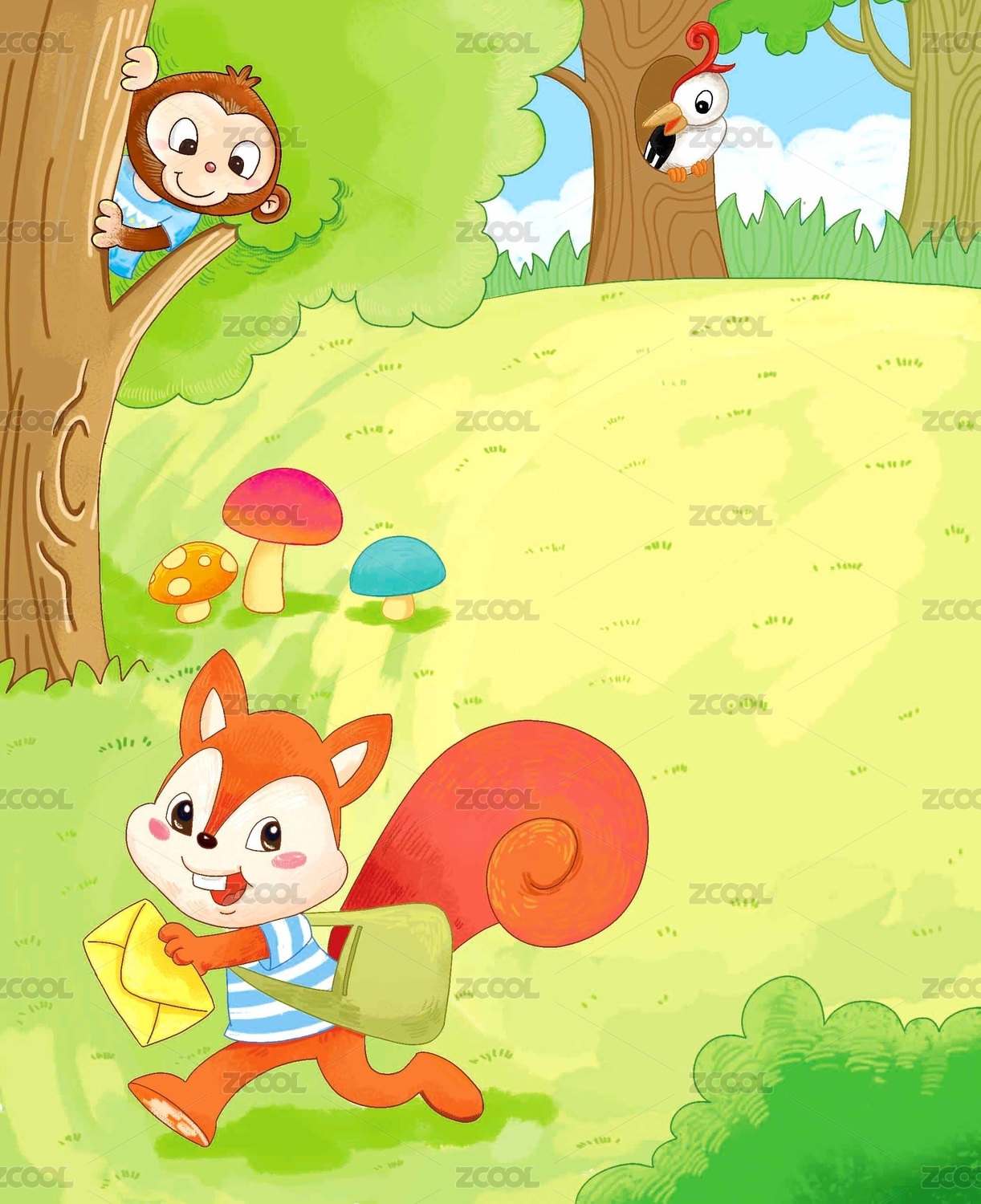 小狐狸、小狗、小兔子、小猫和小青蛙在兴趣盎然地读英语书