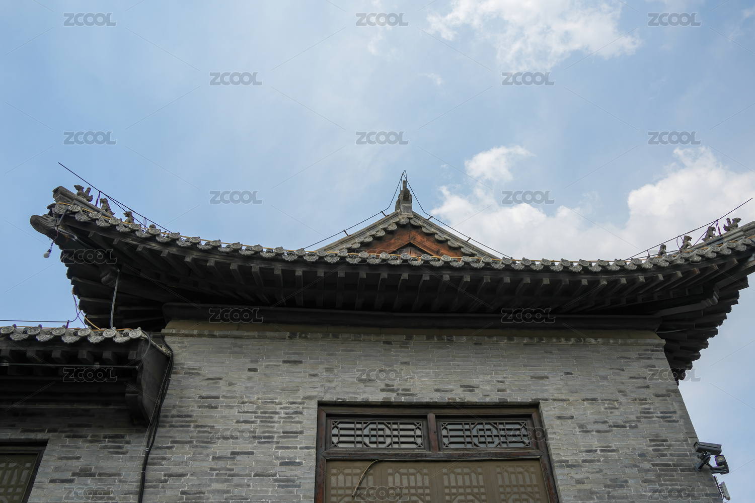 福州上下杭景区传统砖瓦房与绿树蓝天景象