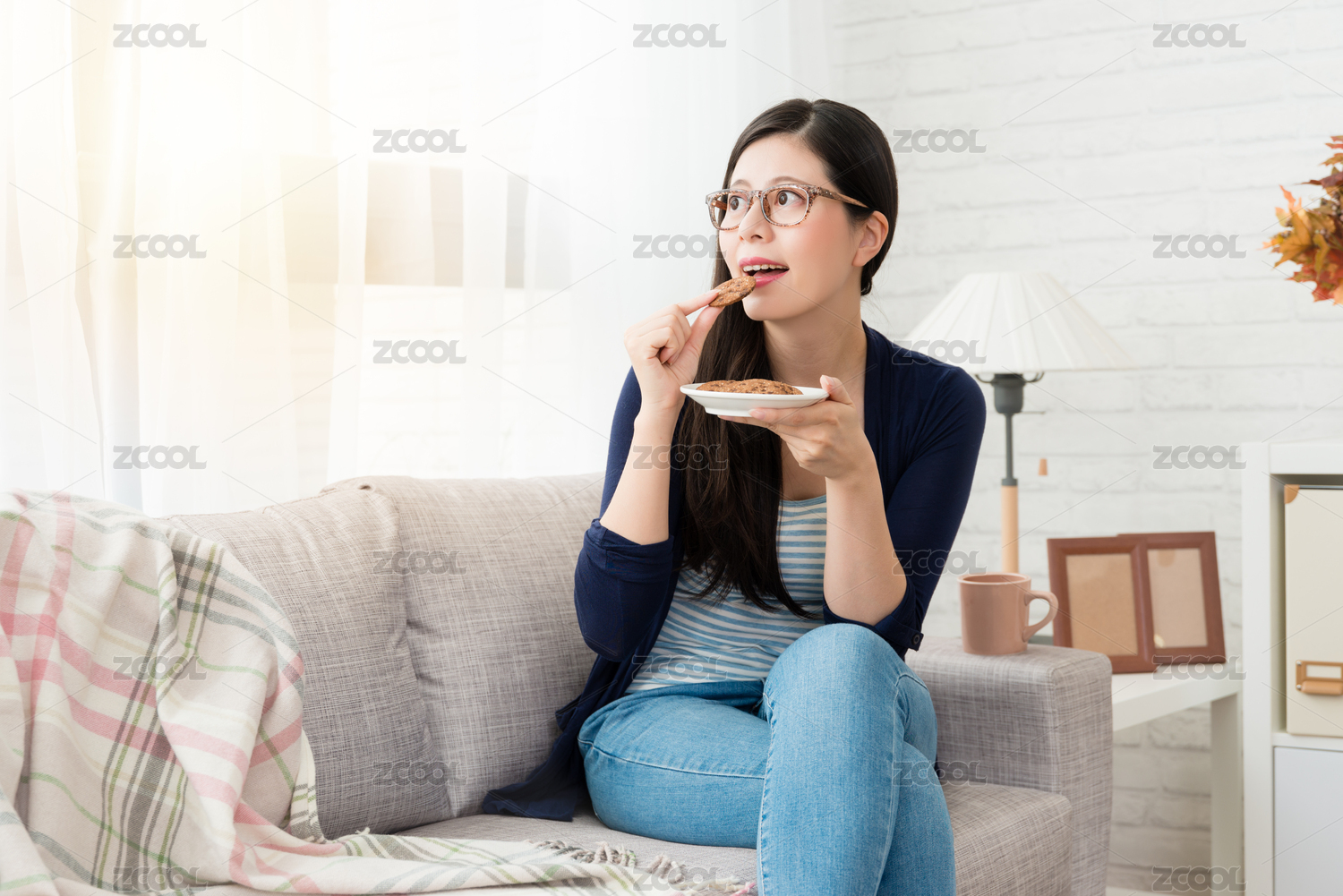 美丽的亚洲女性喜欢吃饼干和在家里秋冬季节放眼远眺在客厅的窗户