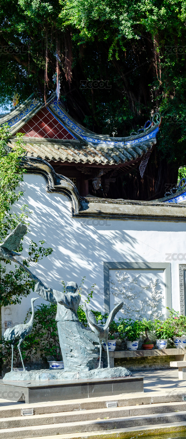 福州林则徐纪念馆中式建筑旁的仙鹤人物雕塑