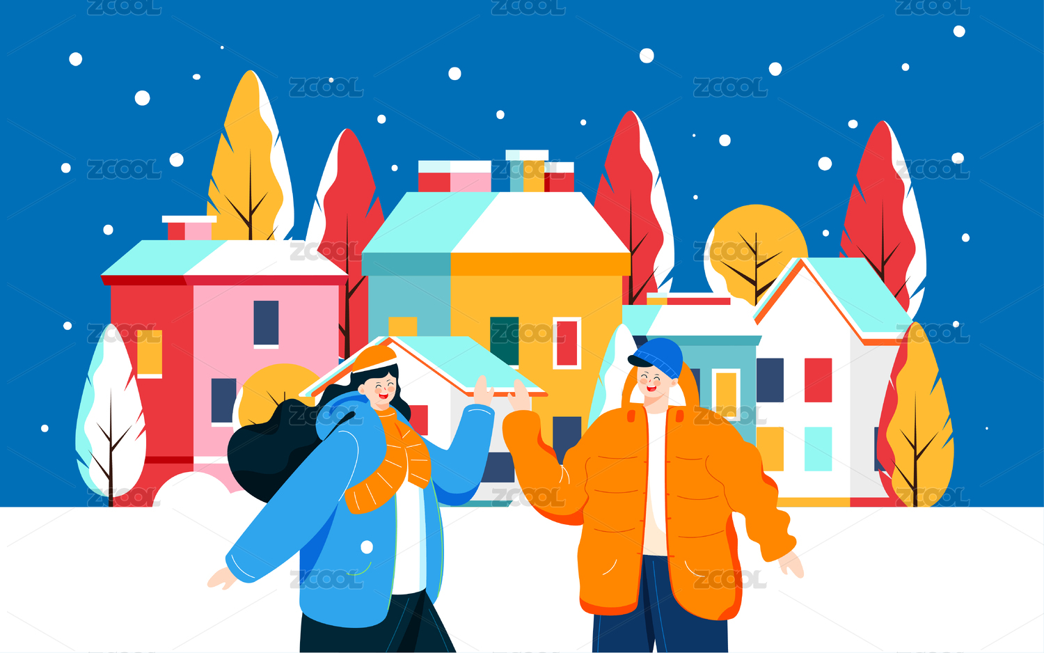 冬季建筑雪景插画冬天人物城市道路户外海报