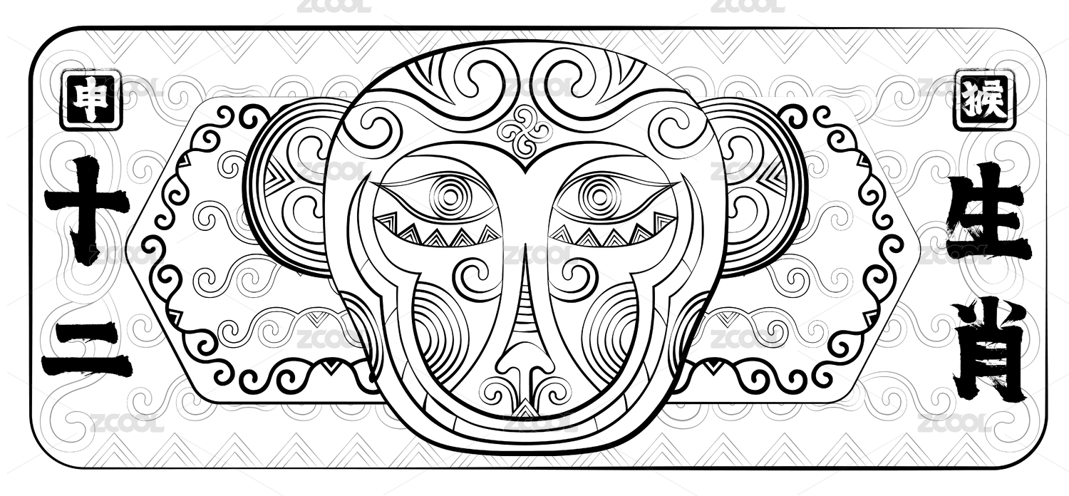 猴十二生肖黑白简约中国风印花图案矢量插画