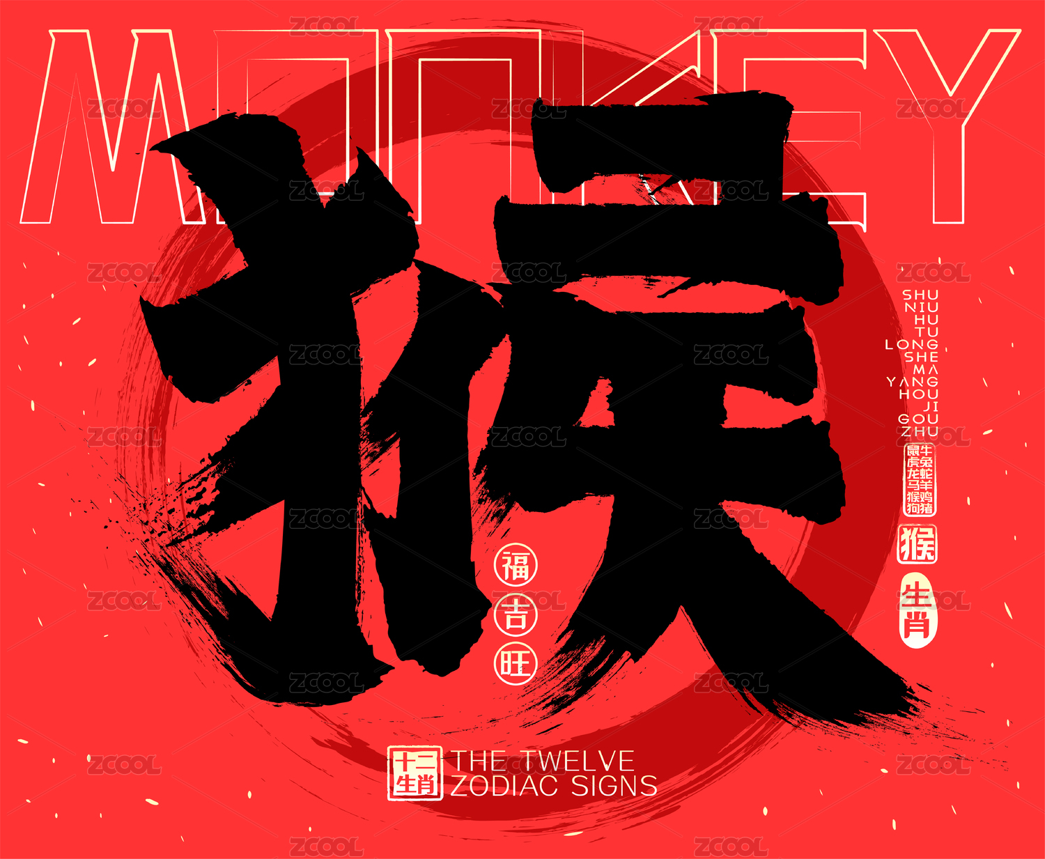申猴十二生肖潮流印花图案传统纹样矢量插画
