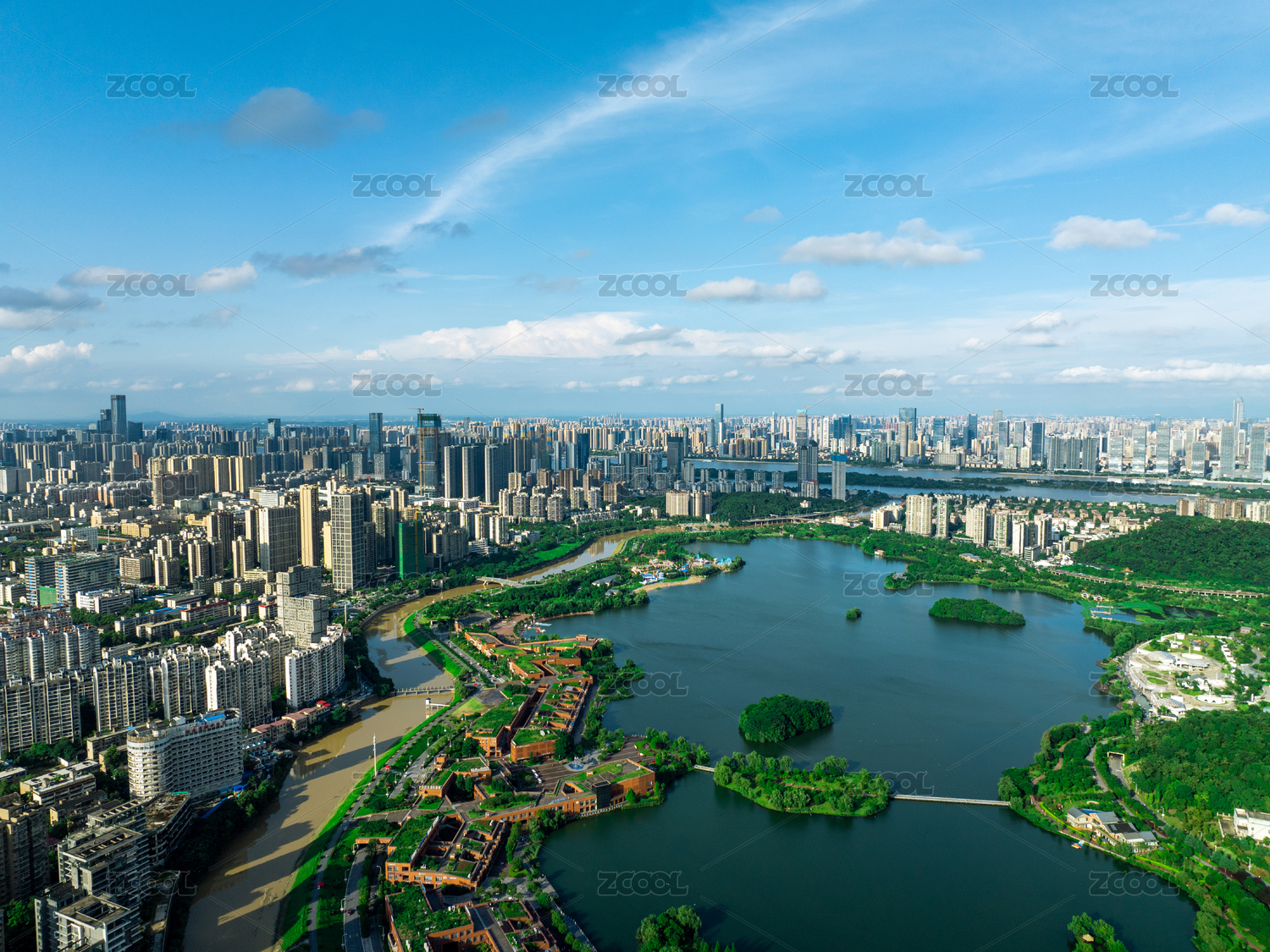 中国湖南长沙航拍视角下捞刀河畔的乡村与城