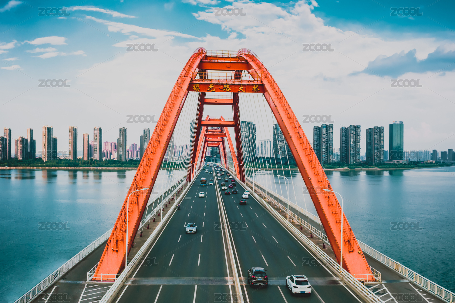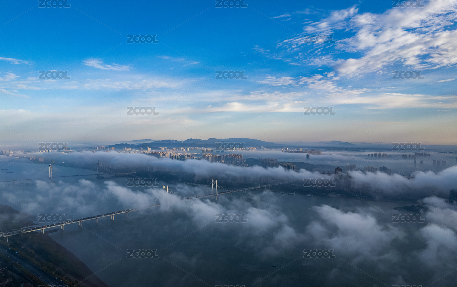 湖南长沙清晨云雾中的三汊矶大桥航拍