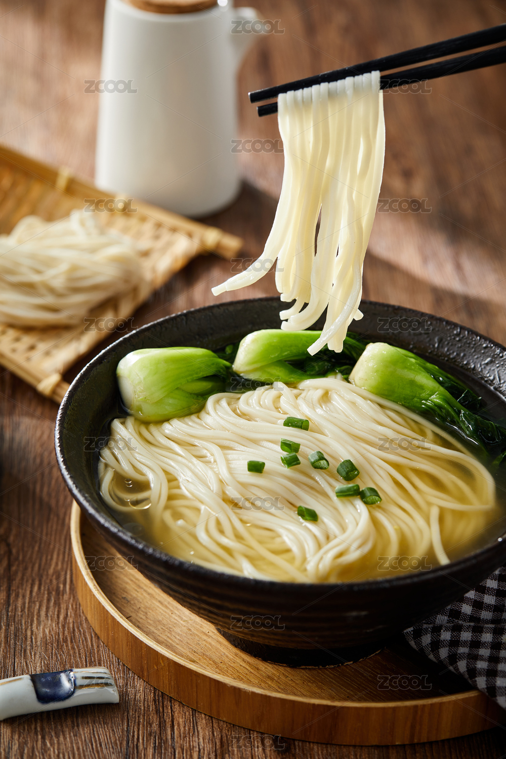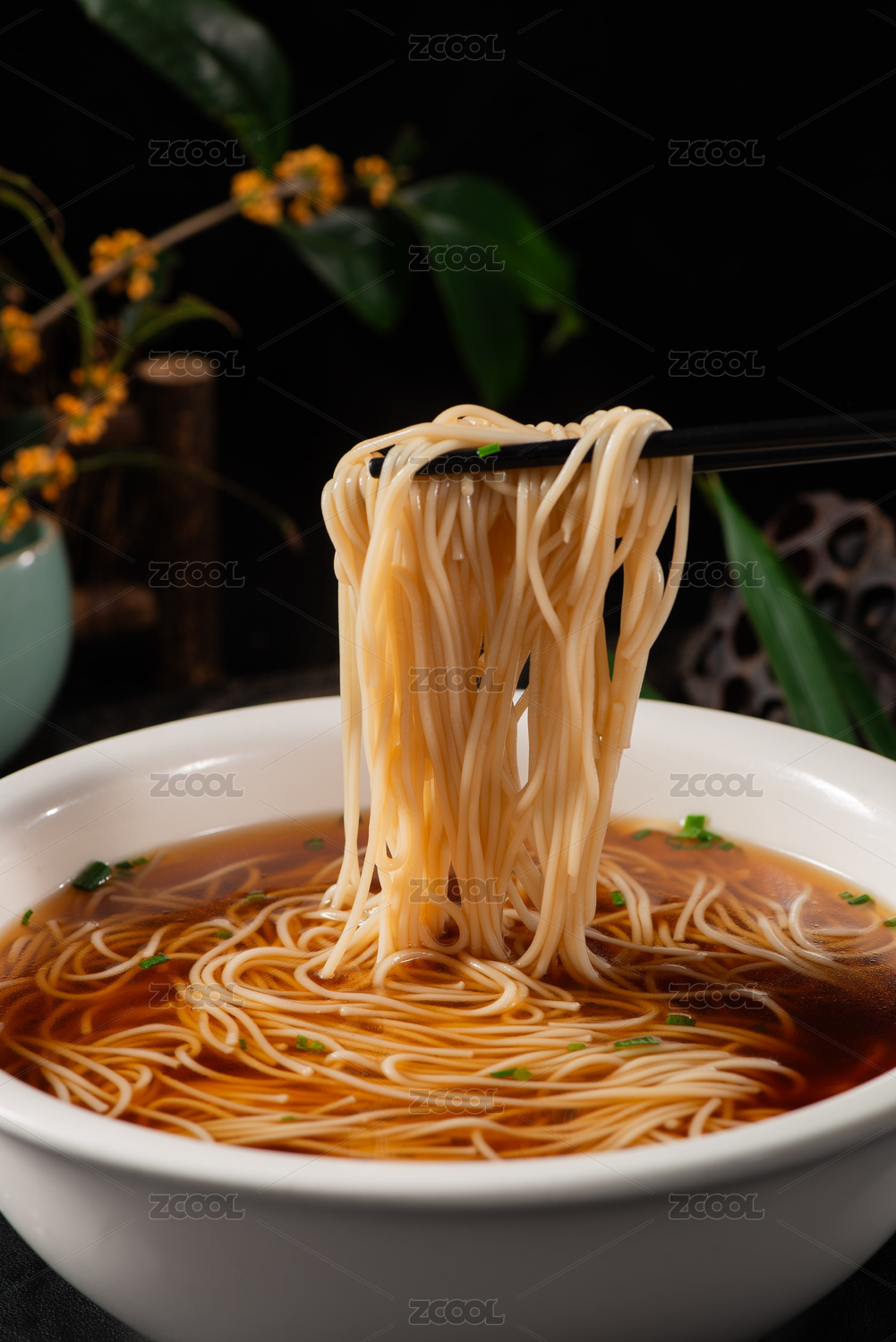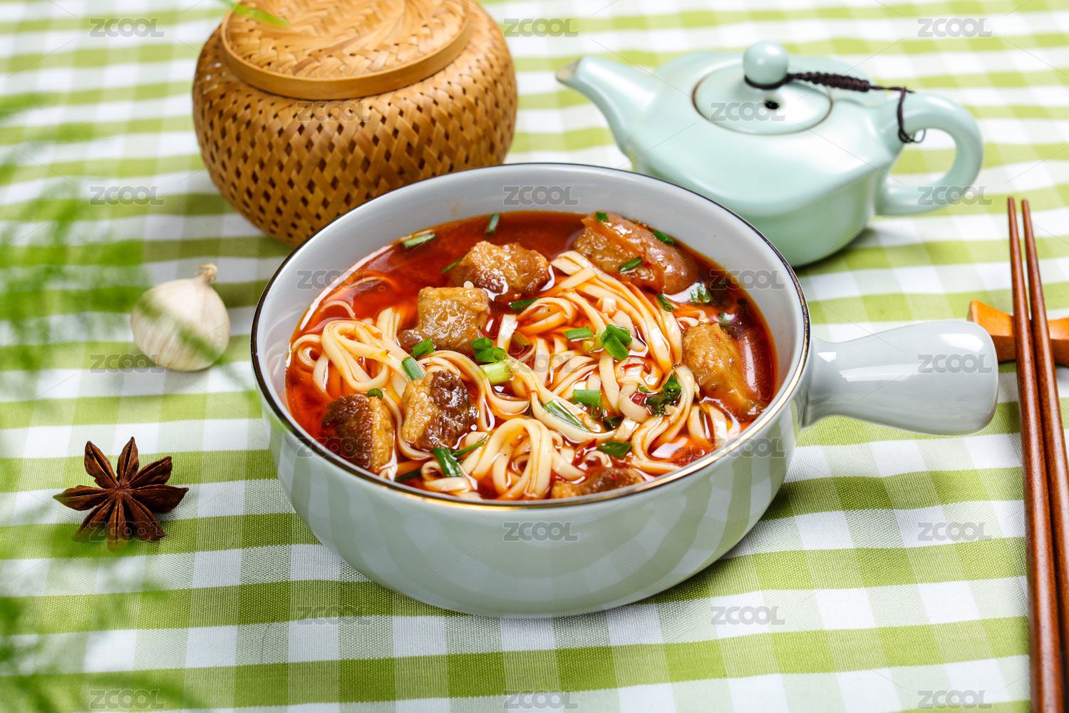 竹底上放着一碗牛肉汤面和筷子上叉着面条