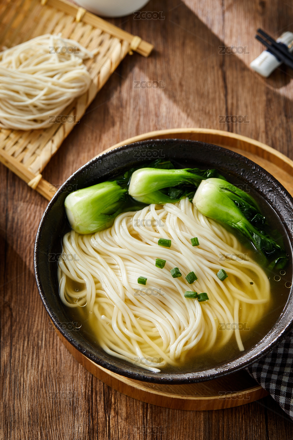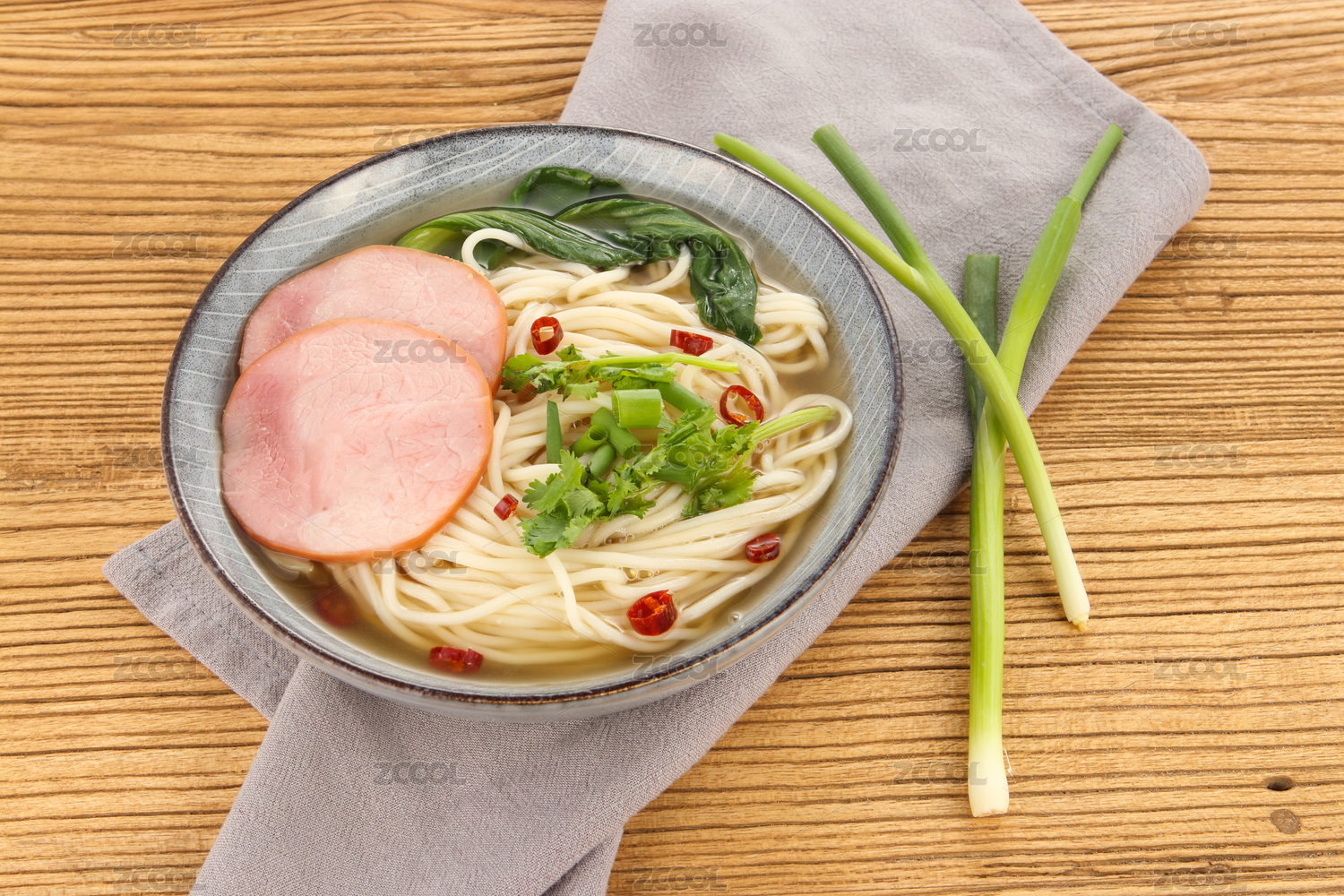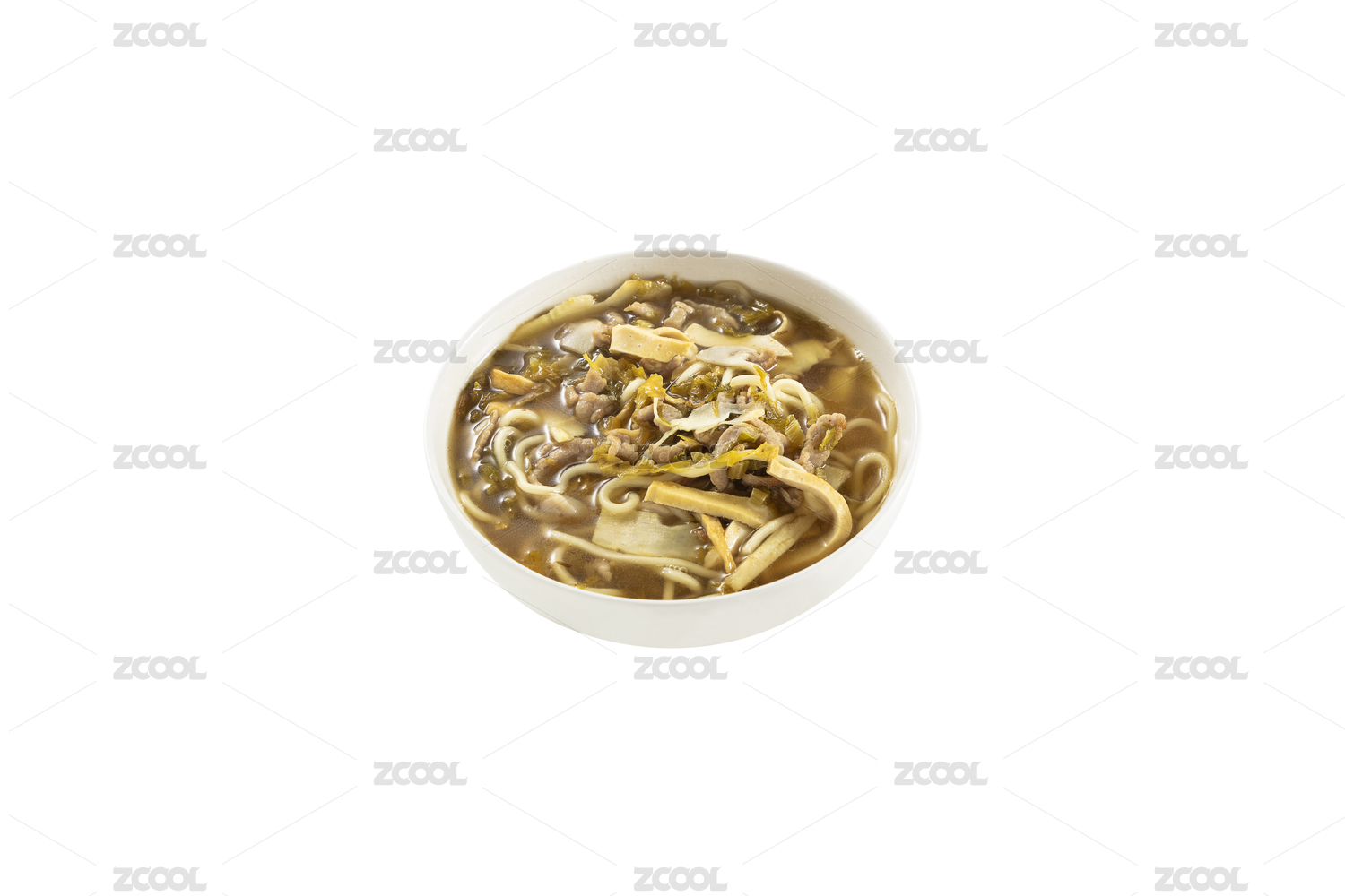 竹底上放着一碗牛肉汤面和筷子上叉着面条