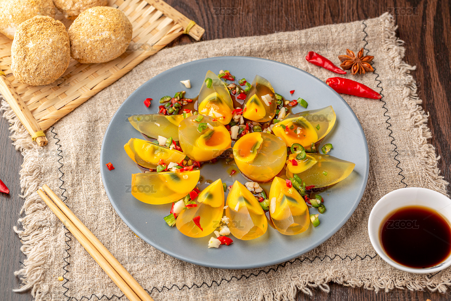 木桌背景一盘凉拌皮蛋