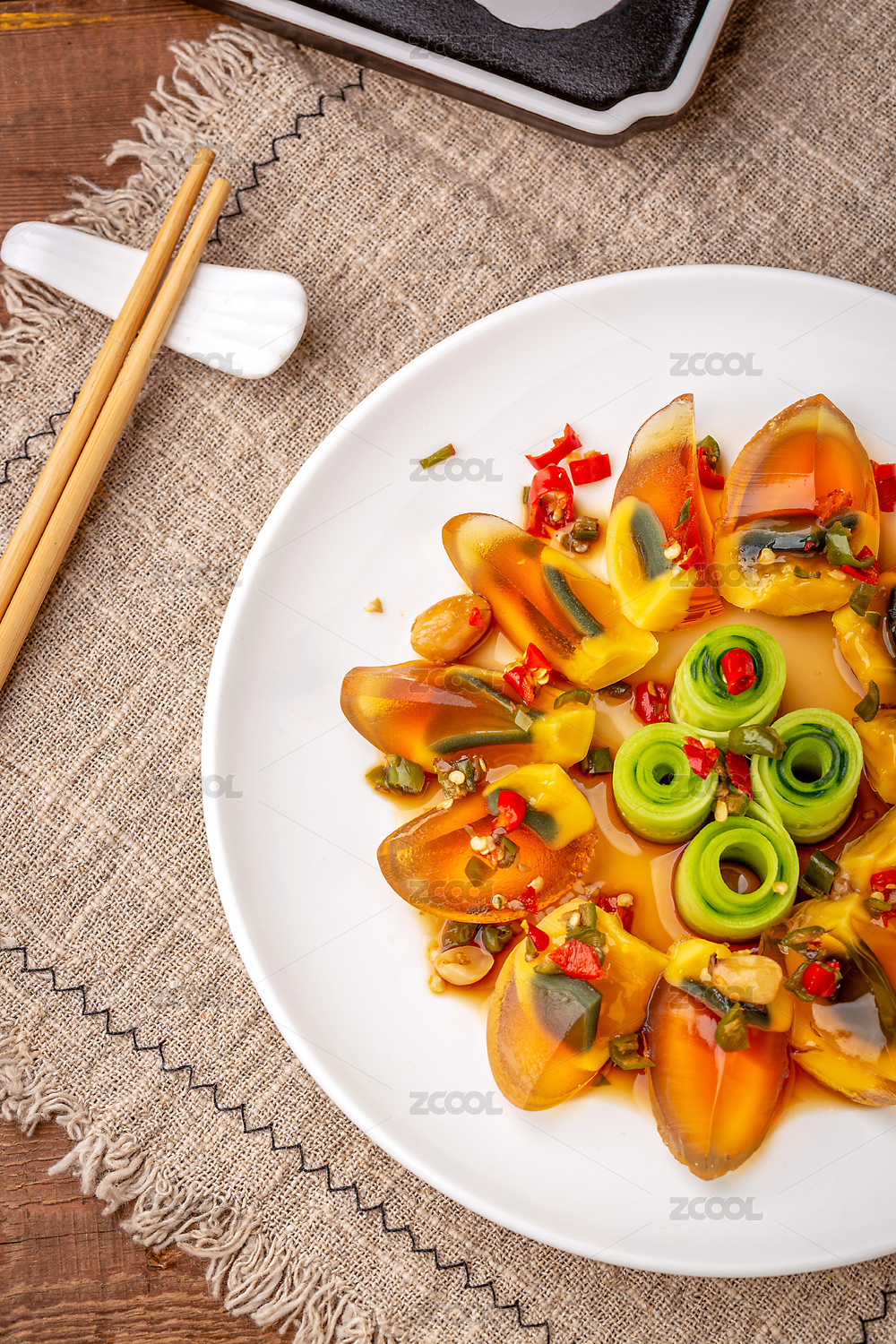 桌面上的盘子里的美味可口的凉拌皮蛋