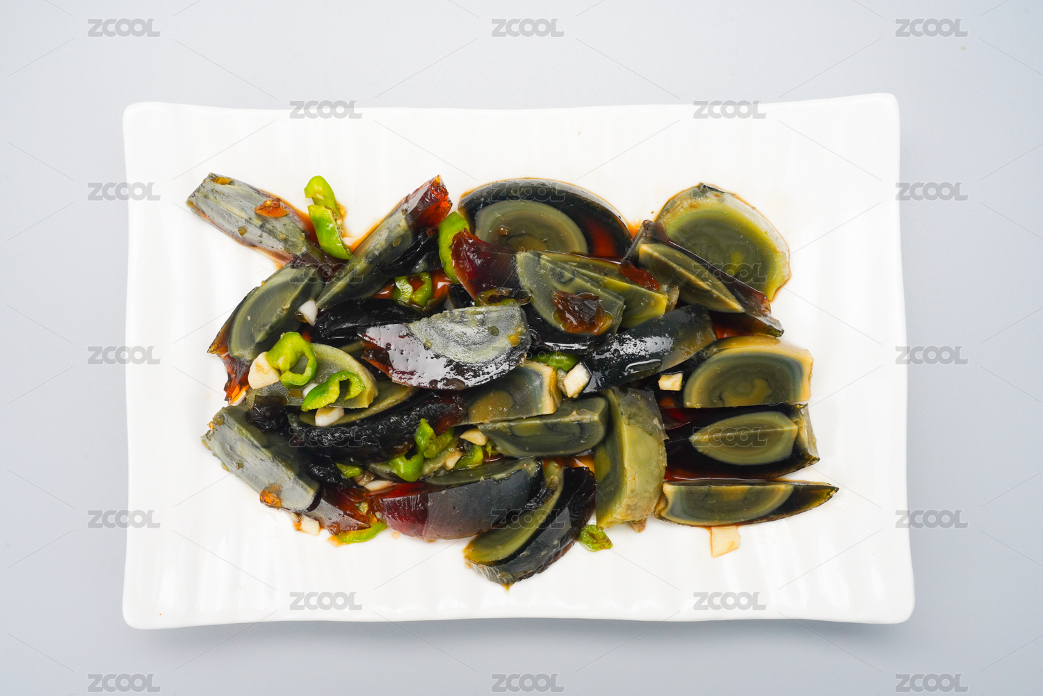 白盘里的麻辣鲜椒凉拌皮蛋