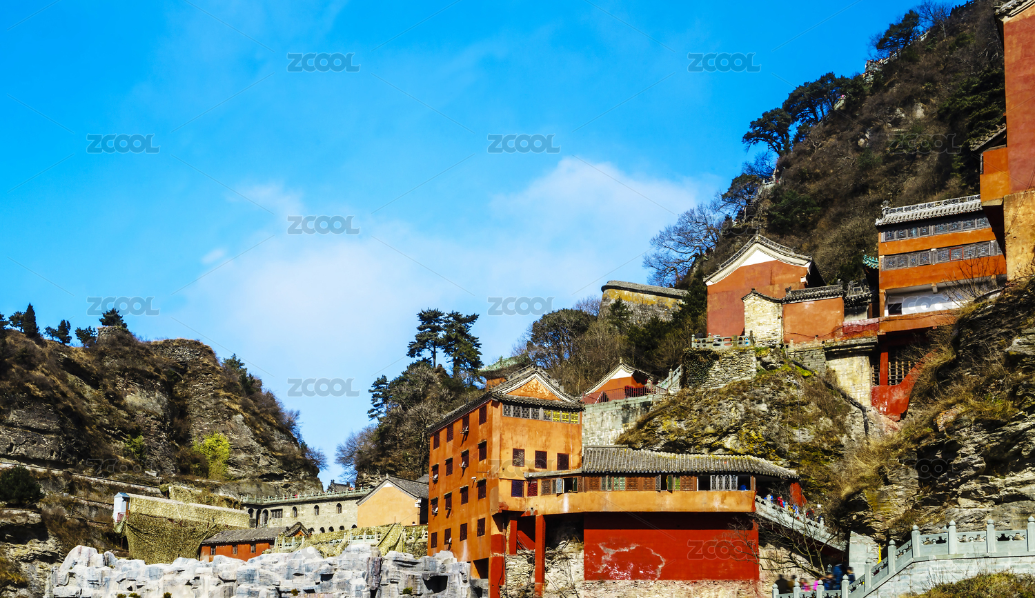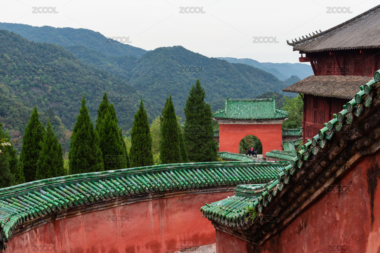 中国湖北武当山太子坡的红墙绿瓦九曲墙
