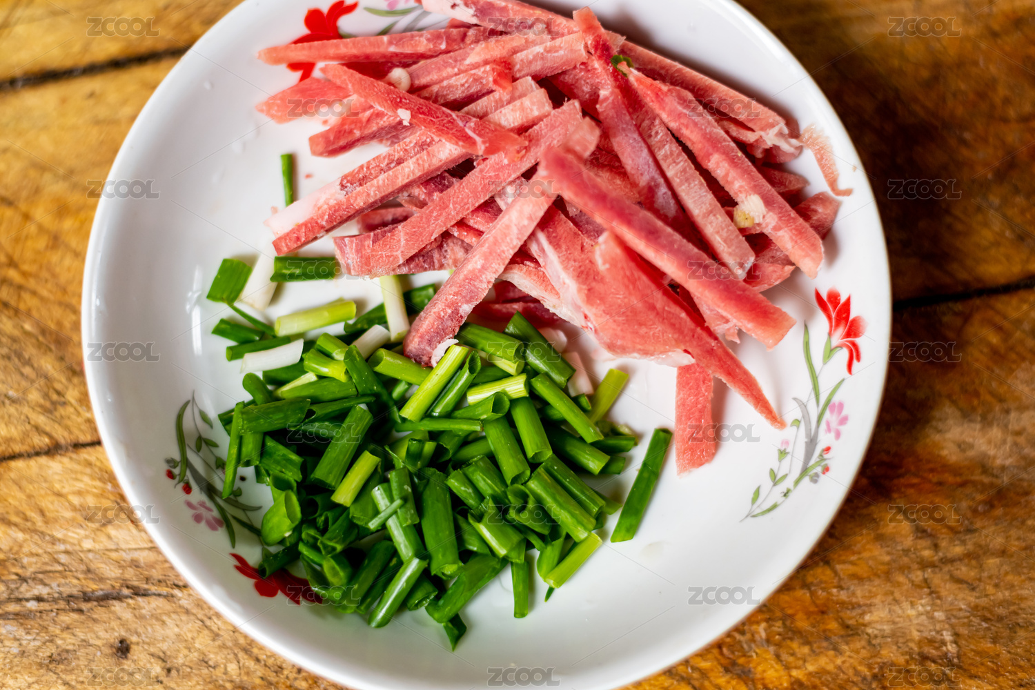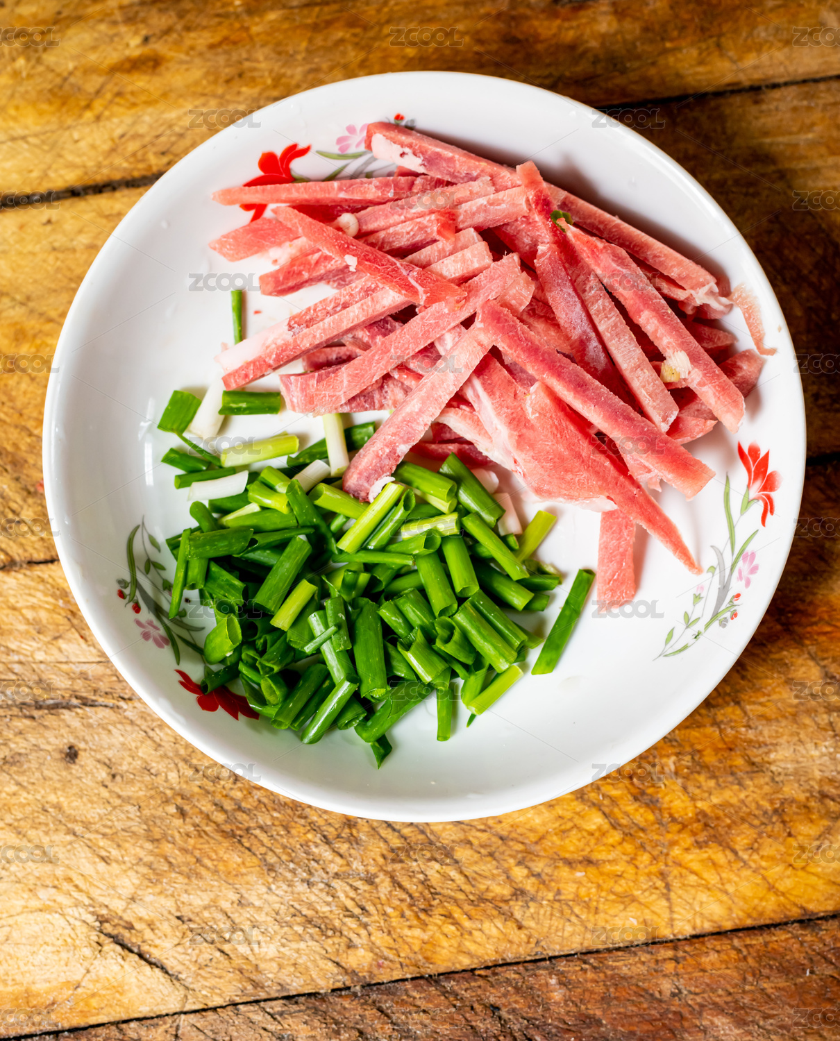 盘子里的蒜苔炒肉