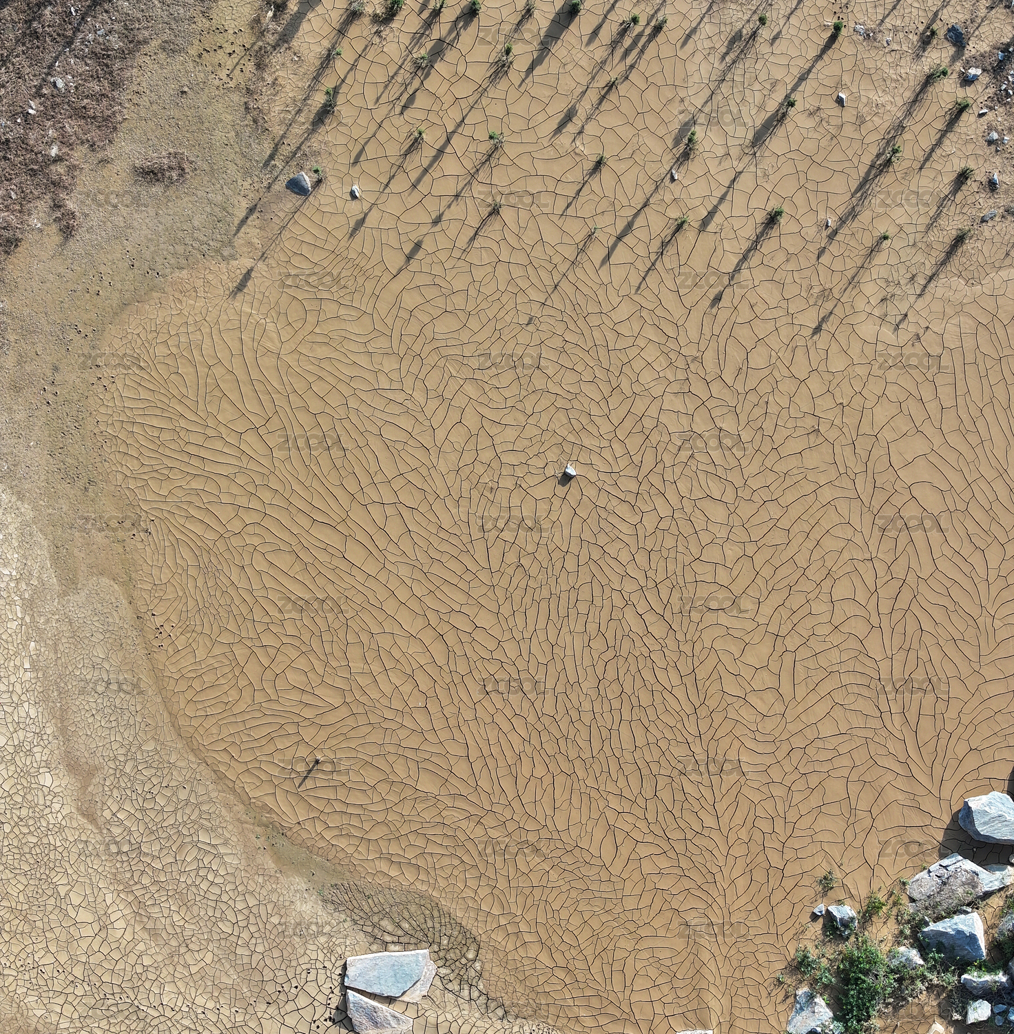 俯拍一片干涸的土地上的小树和网状裂纹