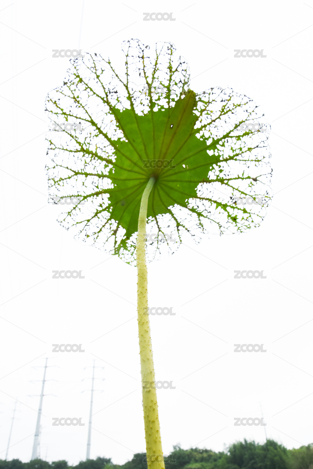 仰拍枯萎成网状的绿色荷叶
