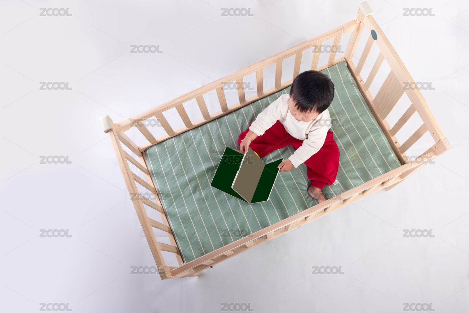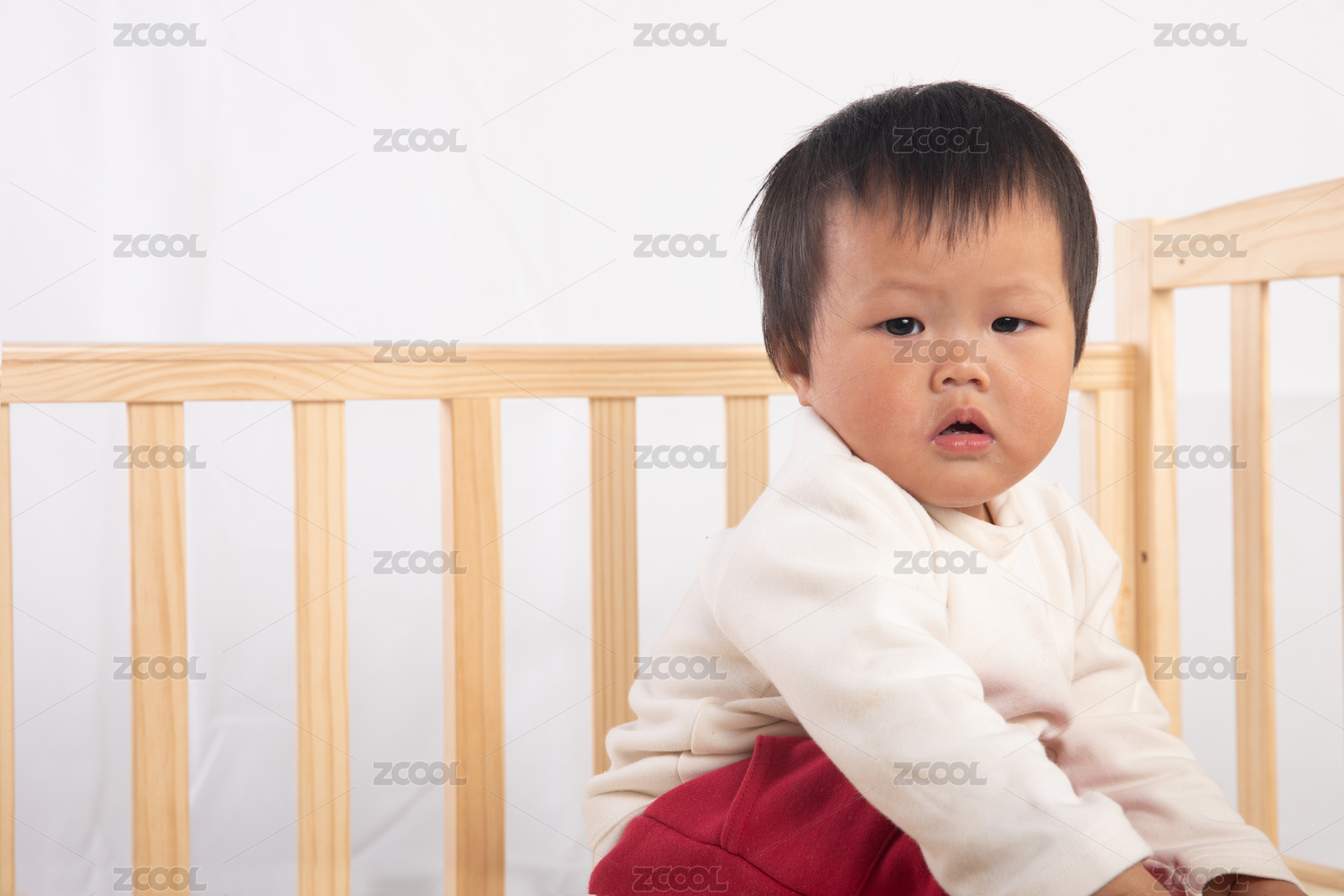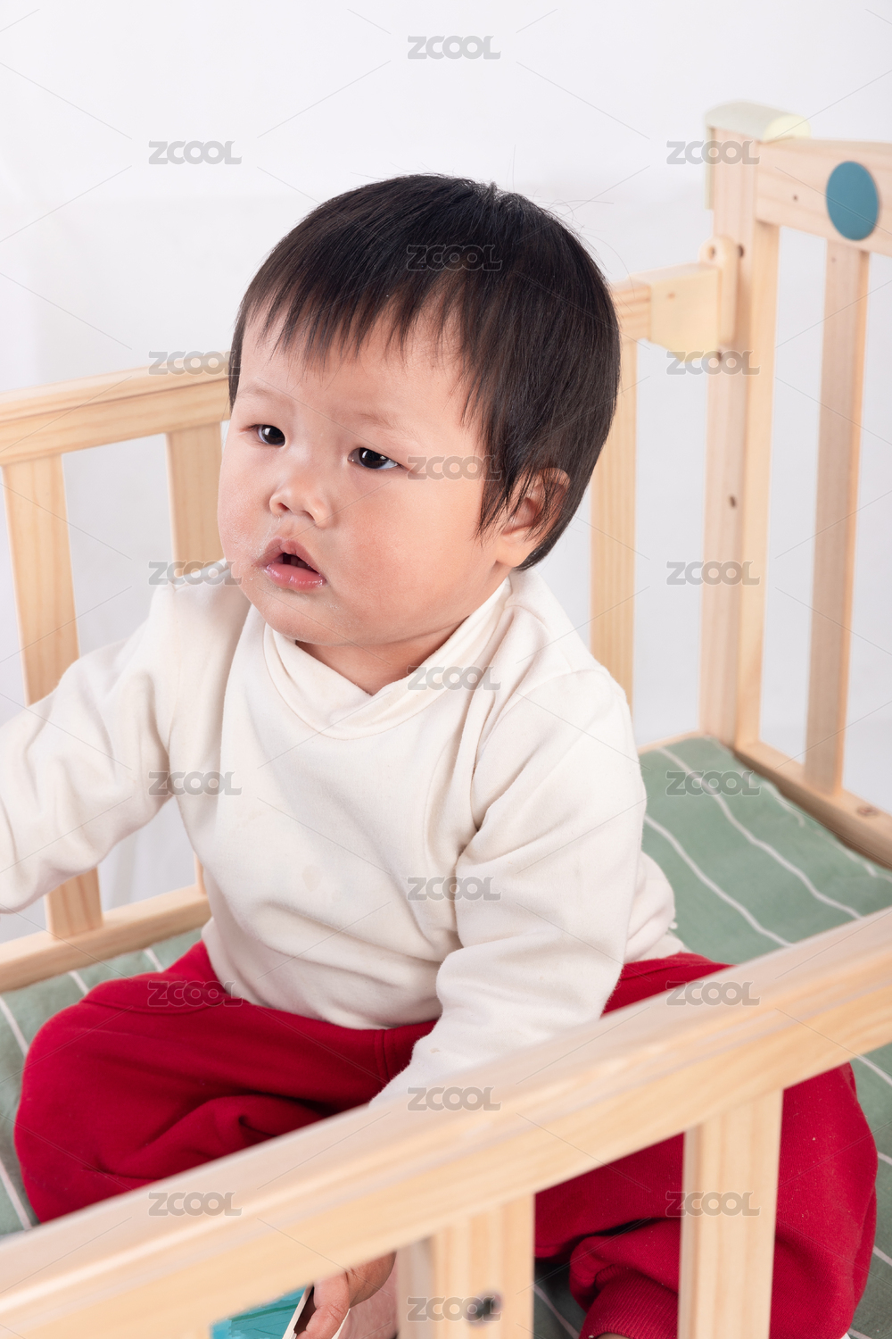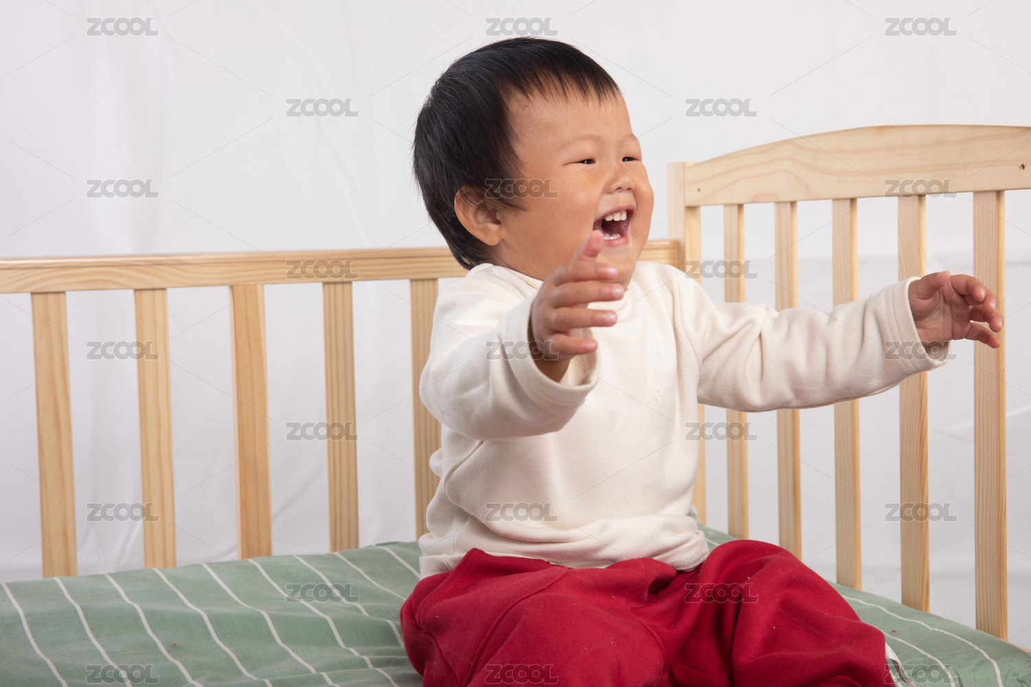 坐在婴儿床上张开双手大笑的亚洲宝宝