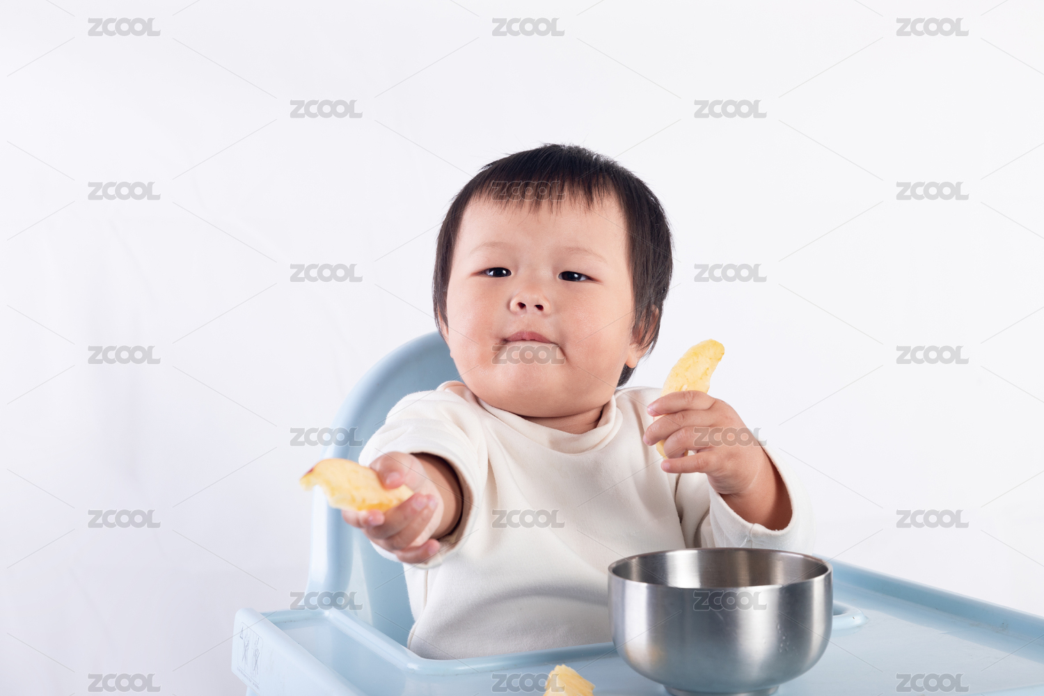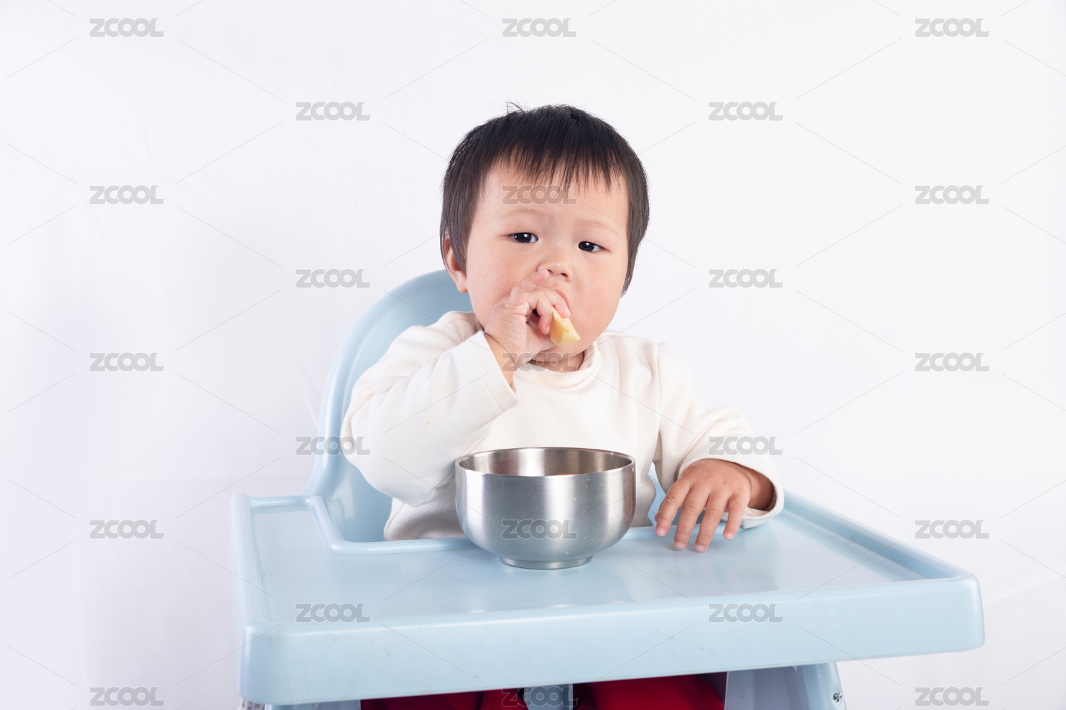 坐儿童餐桌上的亚洲宝宝手拿食物