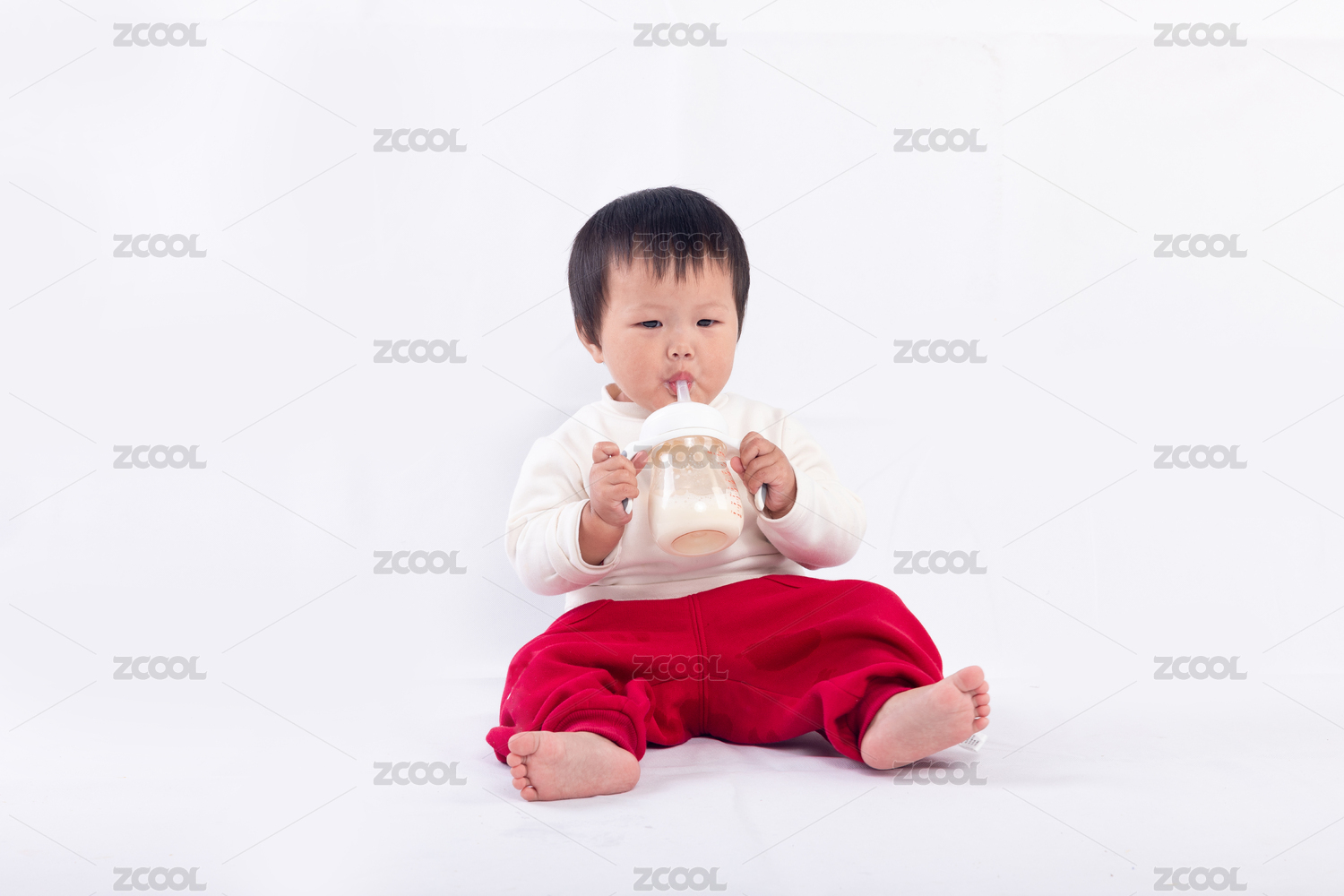 亚洲宝宝坐着手握奶瓶认真喝奶的白底图