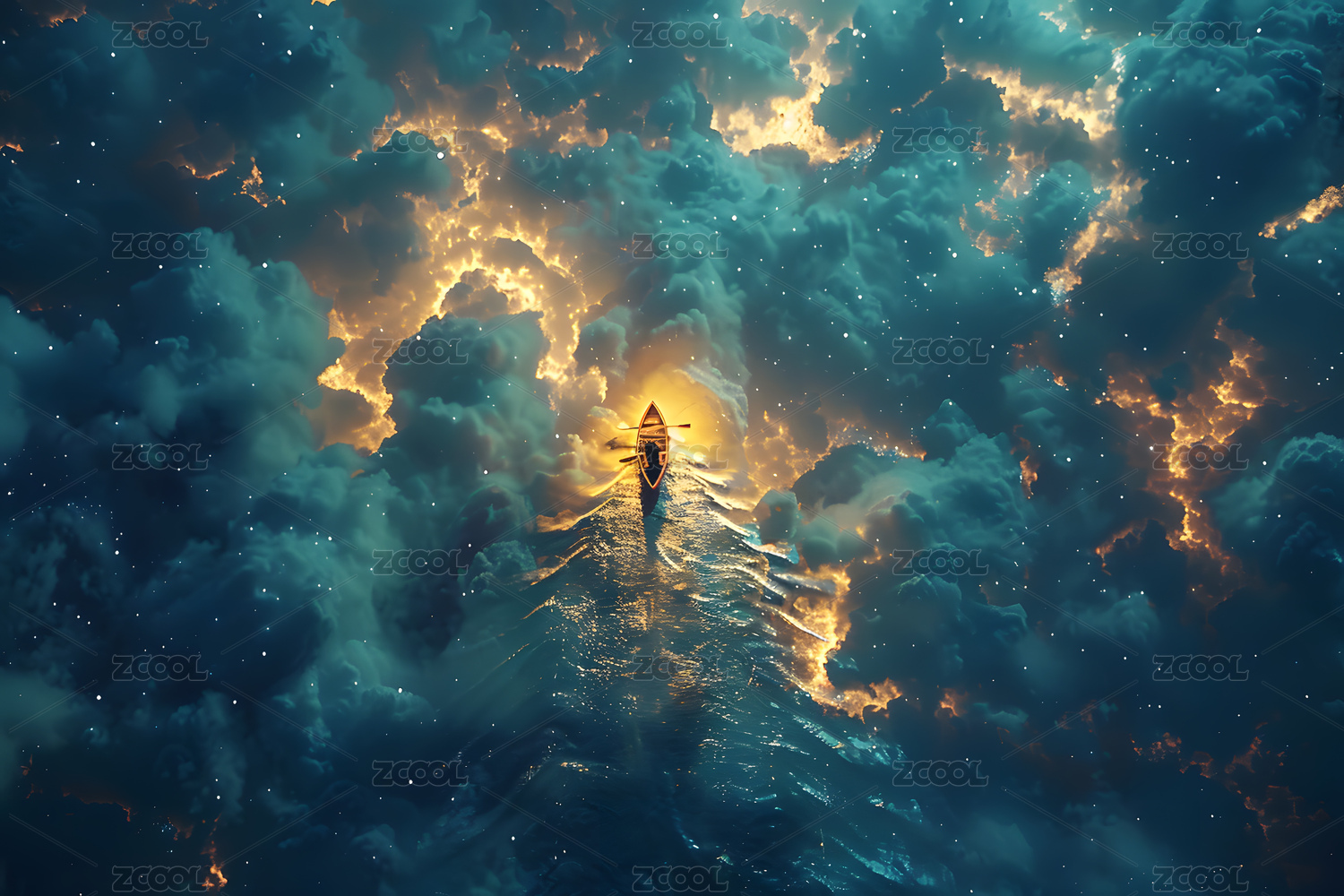 蓝色的海面上漂浮着纸船,背景是银河和弯弯的月亮