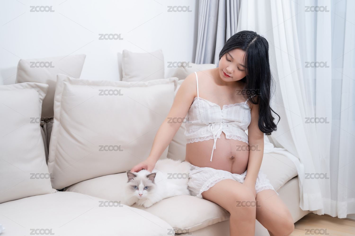 沙发上孕妇正在抚摸猫咪